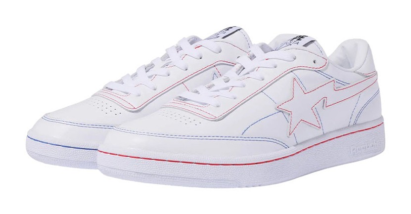 This collaboration sneaker takes the classic, minimalist silhouette of the Reebok Club C 85 and incorporates A Bathing Ape's iconic BAPE STA elements. The shoe features a clean white leather upper with contrast stitching in colors (red, blue, purple, and green) that are subtly placed to represent BAPE's signature camo pattern. A key feature is the BAPE STA star logo replacing the Reebok Vector logo on the lateral side of the left shoe, while the right shoe retains the Reebok Vector, adding an asymmetrical detail. The heel features "BAPESTA" branding, and the tongue tag features a co-branded APE HEAD and Reebok Classic lock-up logo.
