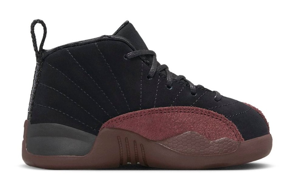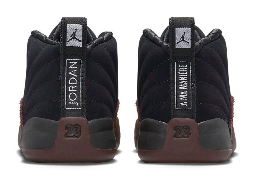This sneaker is one of two colorways released as part of the A Ma Maniére collaboration. It is a premium, monochromatic design featuring a Black upper crafted from luxurious, quilted suede on the top section. The signature mudguard is rendered in a textured, cracked leather-like material, and the inner lining is made of soft, quilted fabric. The only significant contrasting color is Burgundy Crush (a deep, rich wine color), which is applied to the eyelets, the embroidered branding on the tongue and heel, and the heel pull tab, giving the sophisticated shoe a signature A Ma Maniére touch.