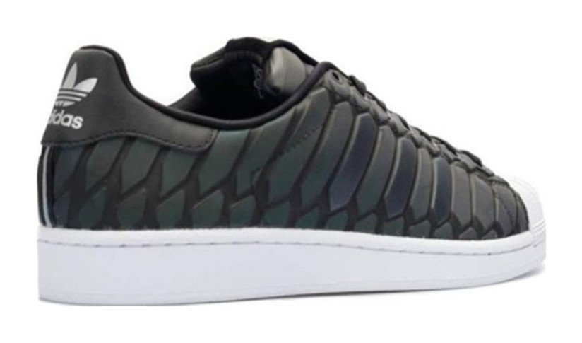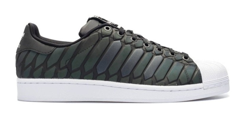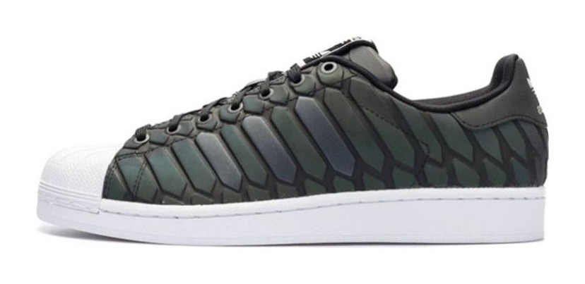 The Adidas Superstar 80s Xeno, colorway Core Black (D69366), is a special-edition sneaker released in 2015. The shoe's most notable feature is its iridescent, snakeskin-inspired upper, which appears black or grey in normal lighting but explodes into a vibrant rainbow spectrum when hit by direct light, like a camera flash. This futuristic design is balanced by classic elements such as the iconic white shell toe and sole.