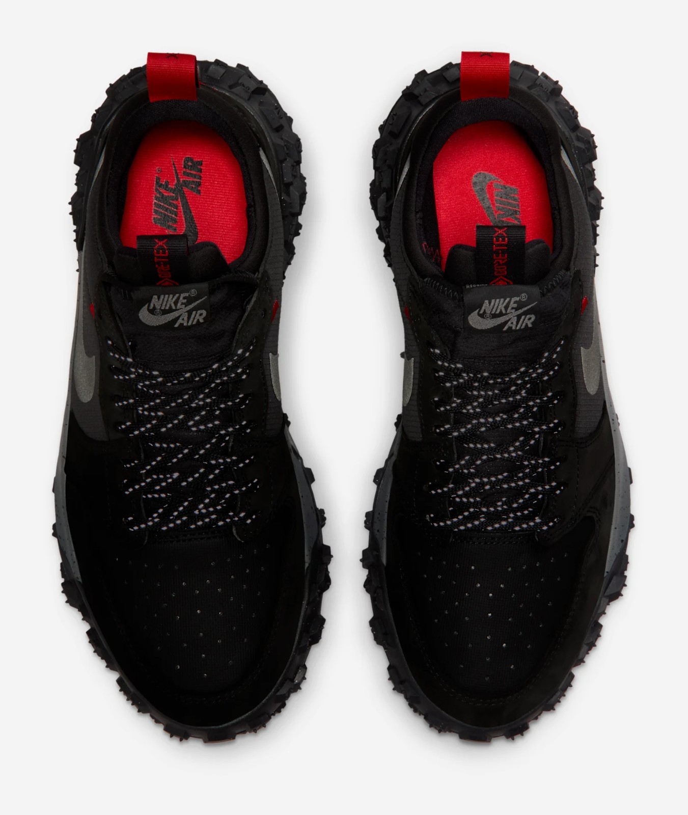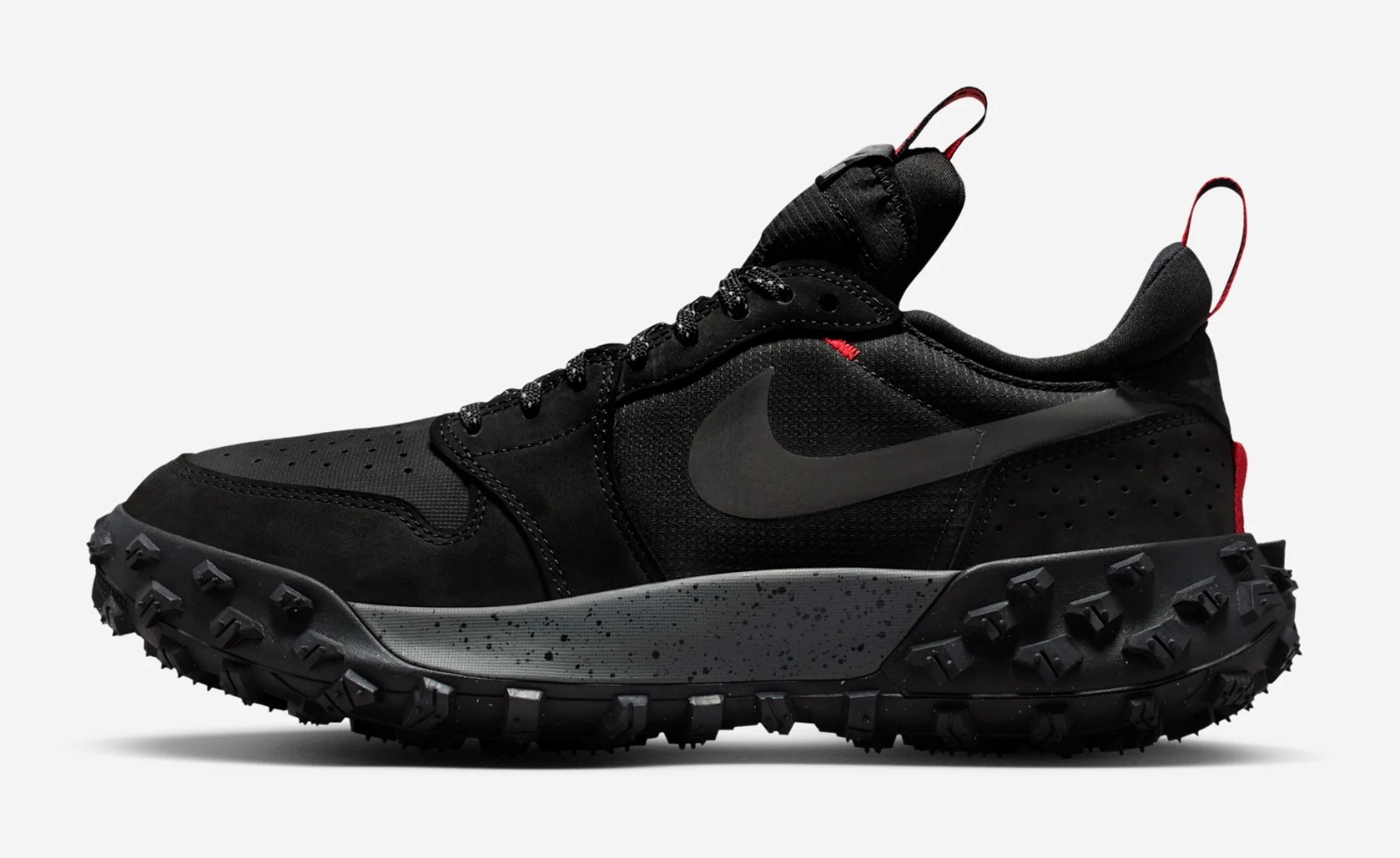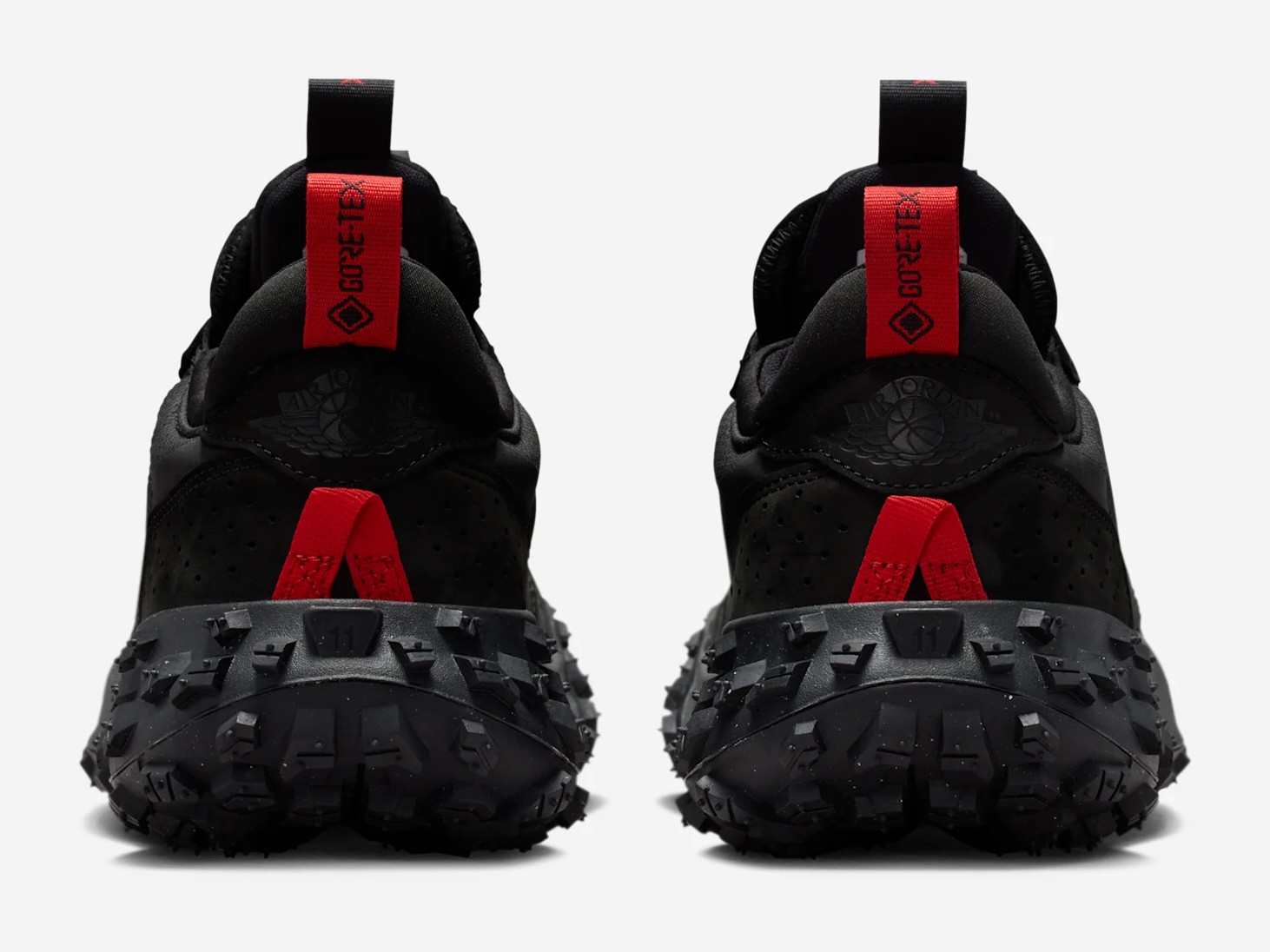 This outdoor-inspired sneaker from the Jordan Brand blends the iconic design of the Air Jordan 1 with rugged, weather-resistant materials. The upper is constructed with a mix of leather and textiles, with a predominant color scheme of Black and various shades of grey, including Iron Grey and Dark Smoke Grey, giving it a stealthy and durable look. The key feature is the integration of GORE-TEX technology, making the shoe waterproof. A pop of Challenge Red (a shade similar to Varsity Red or Bred) is typically found on the branding elements, such as the tongue tag or embroidered logos. The shoe is completed with a distinctive, deeply lugged rubber outsole for trail-like traction.