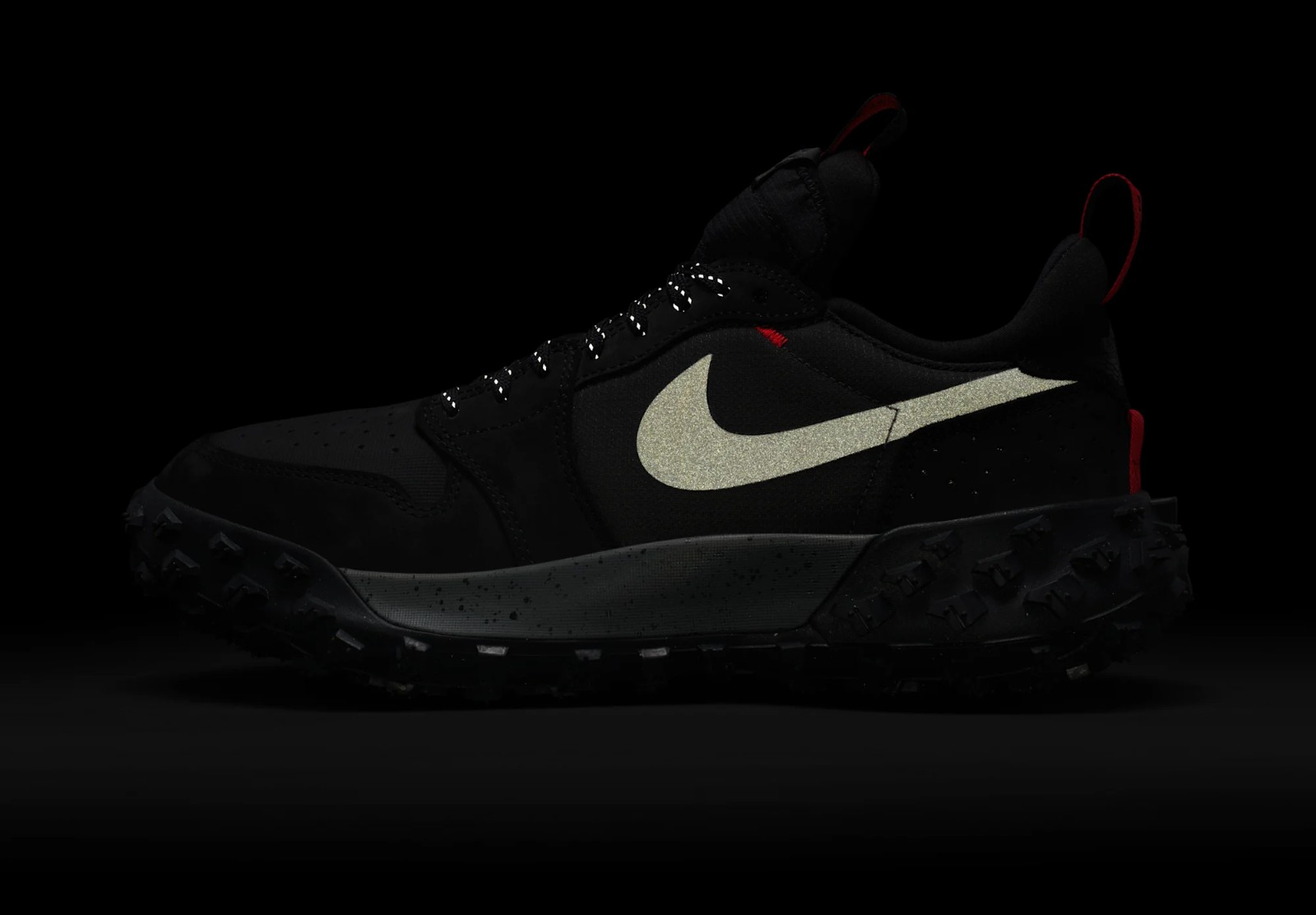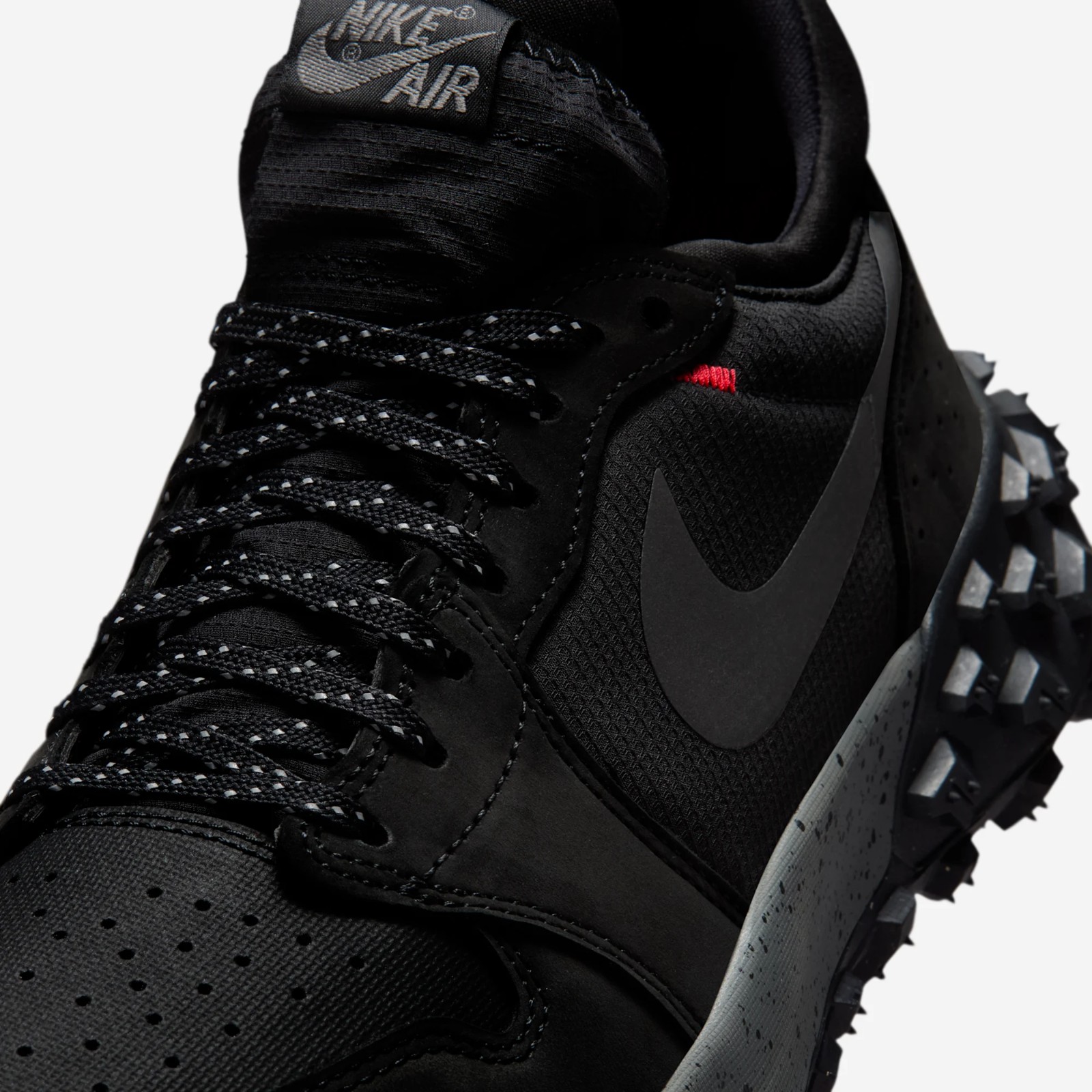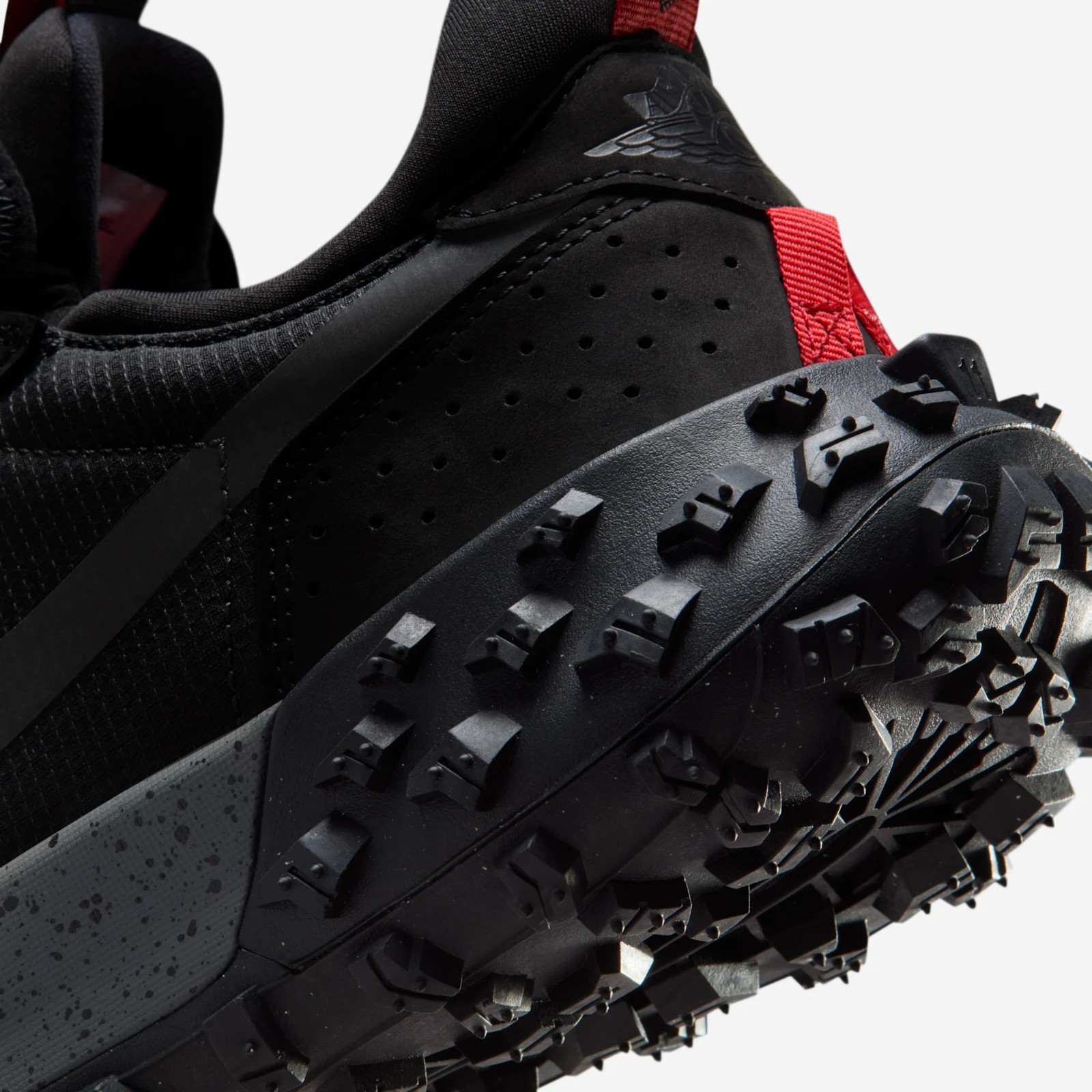 This outdoor-inspired sneaker from the Jordan Brand blends the iconic design of the Air Jordan 1 with rugged, weather-resistant materials. The upper is constructed with a mix of leather and textiles, with a predominant color scheme of Black and various shades of grey, including Iron Grey and Dark Smoke Grey, giving it a stealthy and durable look. The key feature is the integration of GORE-TEX technology, making the shoe waterproof. A pop of Challenge Red (a shade similar to Varsity Red or Bred) is typically found on the branding elements, such as the tongue tag or embroidered logos. The shoe is completed with a distinctive, deeply lugged rubber outsole for trail-like traction.