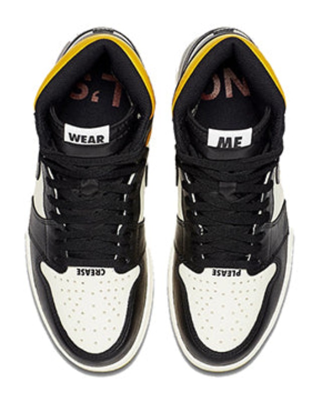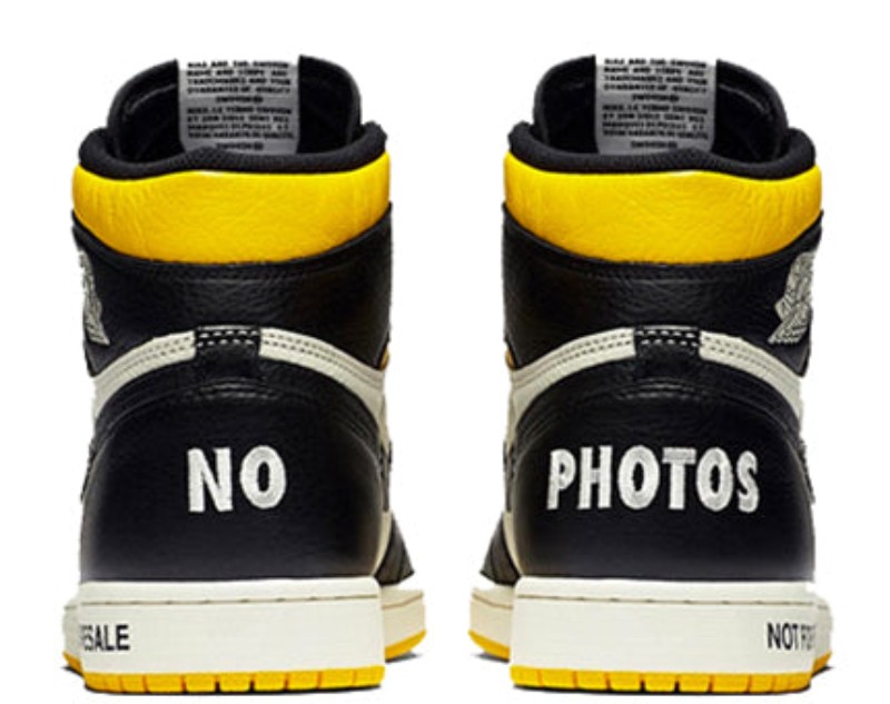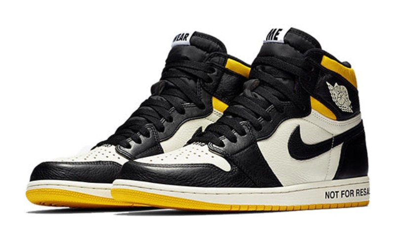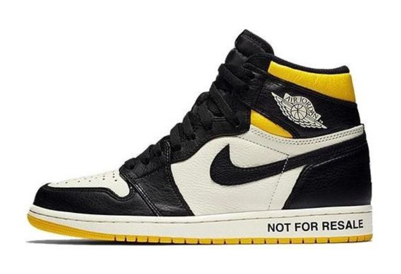 This highly sought-after Air Jordan 1 features a classic "Black Toe"-style color blocking with an intentionally ironic theme. The premium leather upper uses Sail (off-white) for the base, Black for the overlays, and a vibrant Varsity Maize (yellow) on the collar and outsole. The shoe is famous for its tongue-in-cheek text printed across the design, mocking the reselling culture: "NOT FOR RESALE" on the midsole, "NO PHOTOS" on the heel, "PLEASE CREASE" on the toebox, and "NO L'S" (No Losses) on the insoles.