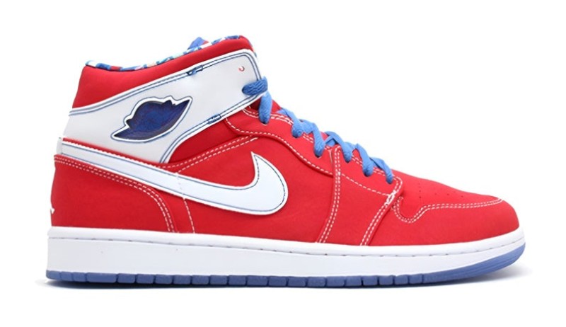 This model features a high-top silhouette built with a Sport Red nubuck upper. It is accented with a clean white Swoosh and ankle collar panel, while Varsity Blue is used as an accent on the outsole, laces, and inner lining. A unique detail on this colorway is the use of a small, jeweled 'Wings' logo on the ankle and a multi-color grid pattern on the interior collar lining, setting it apart from classic Air Jordan 1 releases.