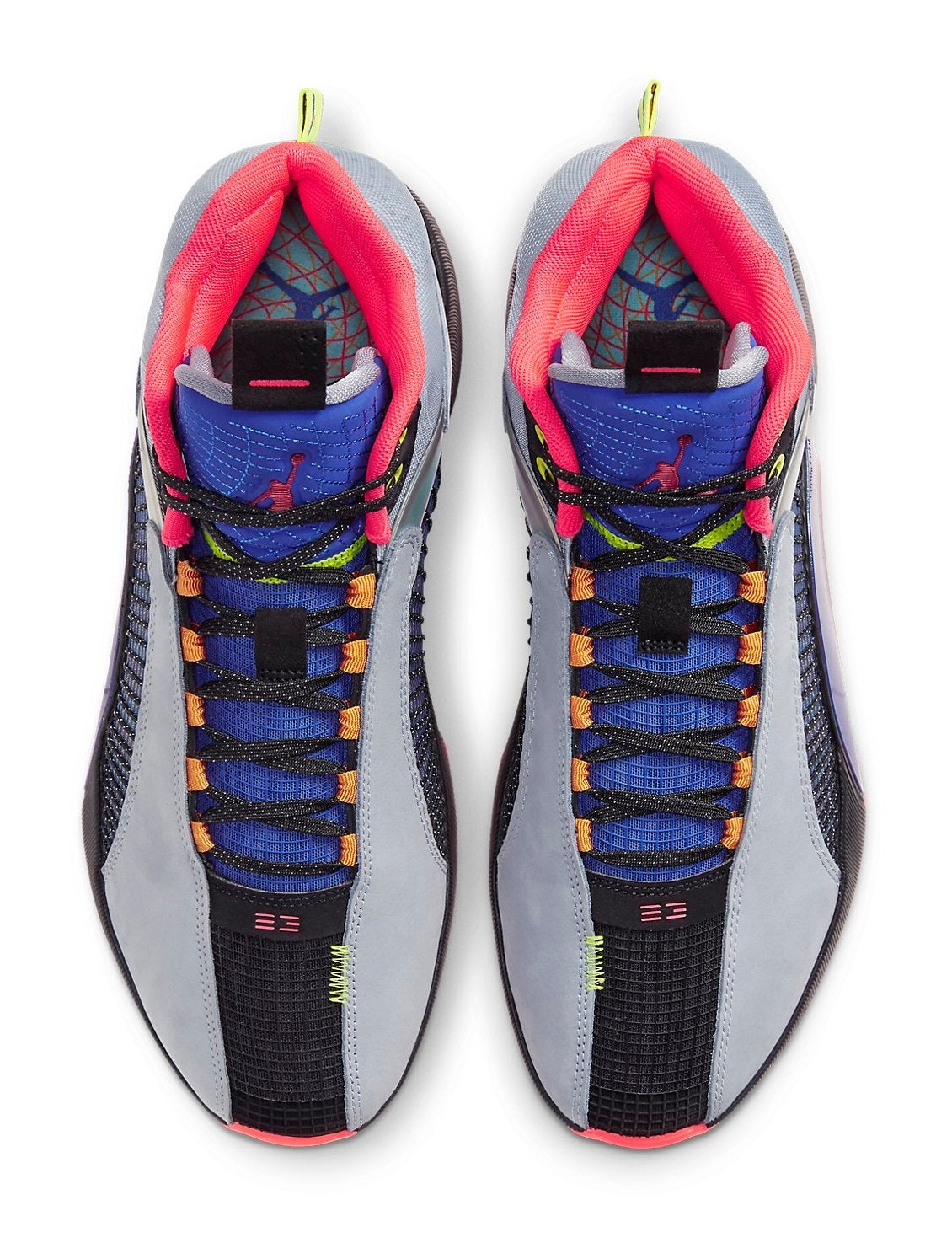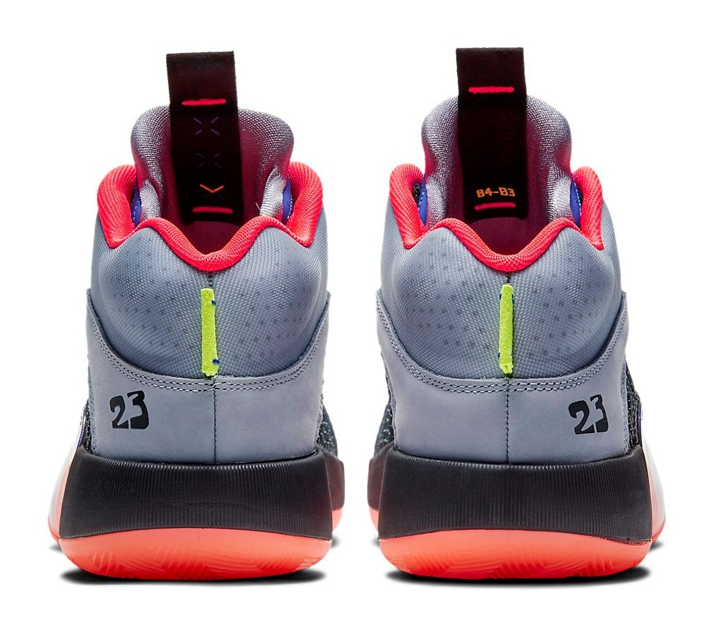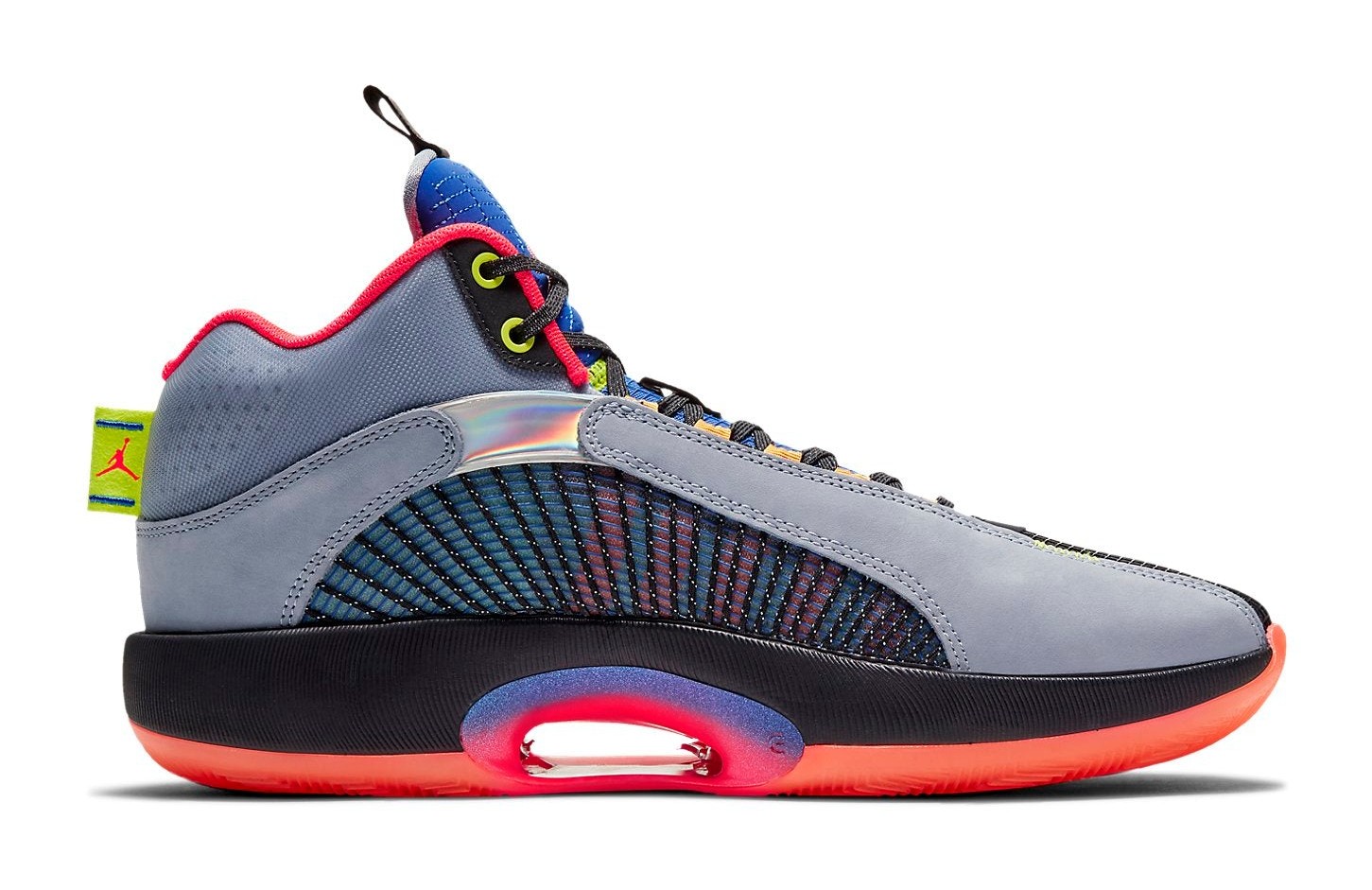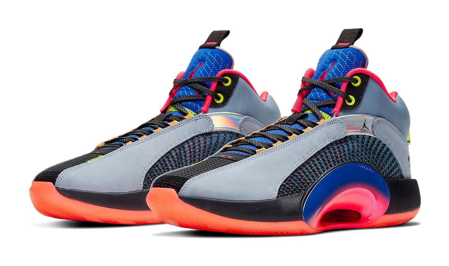 The Air Jordan 35 'Center of Gravity' was the inaugural colorway for the 35th signature Air Jordan model, released to honor the 30th Anniversary of the Air Jordan 5, from which it borrows design cues like the jagged foam collar shape. The shoe's Glacier Grey upper is constructed from an innovative Flightwire cable system encased in a breathable mesh material, emphasizing lightweight support. The "Center of Gravity" theme is expressed through a Multi-Color application on the iconic Eclipse Plate 2.0 (the hollowed-out area in the midsole), which features a dynamic gradient of vibrant colors, including Laser Crimson (red/orange), bright blue, and neon green. A subtle '23' detailing appears on the lateral side, and the heel features a classic "Nike Air" tag in a nod to the AJ5. This particular SKU, with the PF designation, includes an extra-durable rubber outsole for superior traction on outdoor playing surfaces.