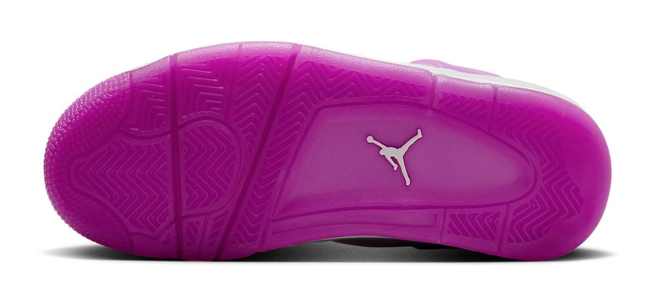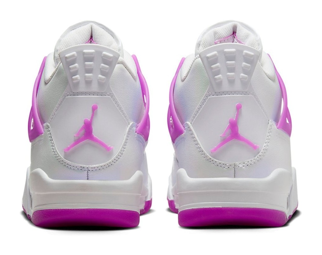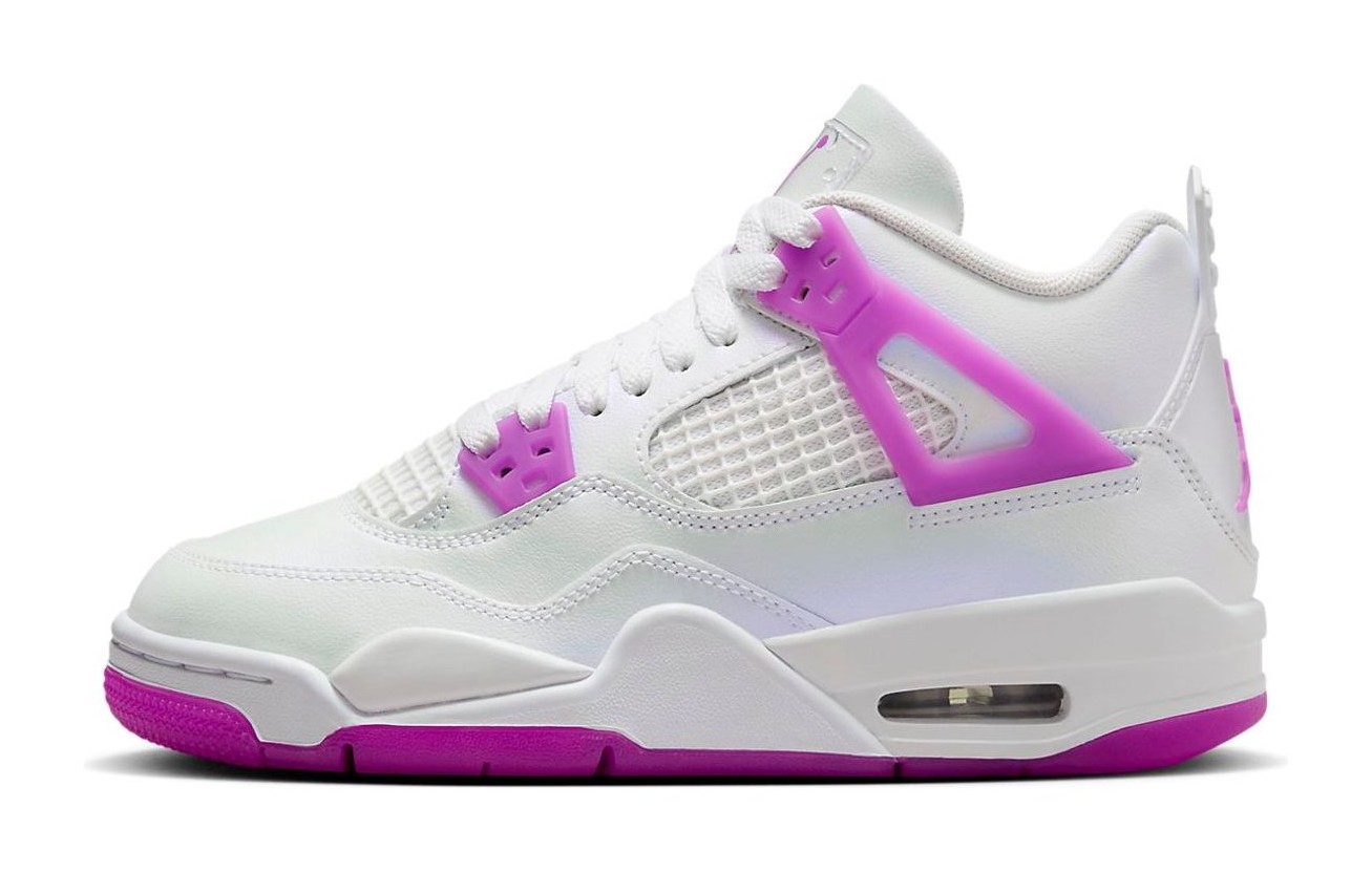 This sneaker is a vibrant, youth-exclusive colorway of the iconic silhouette. The upper is predominantly constructed from clean White leather, maintaining the classic look of the Air Jordan 4. The shoe is energized by bold Hyper Violet accents, which appear on the TPU wing eyelets, the visible Air unit in the midsole, the Jumpman logos on the tongue and heel, and sections of the semi-translucent rubber outsole. The contrast between the bright white base and the striking purple makes this a fun and eye-catching iteration.