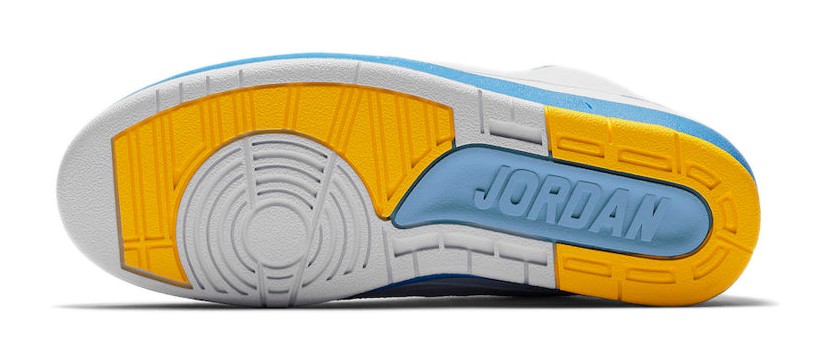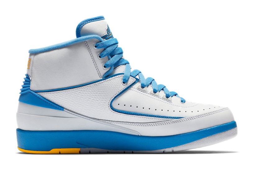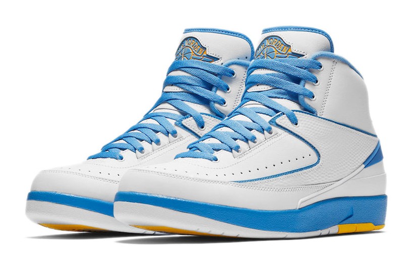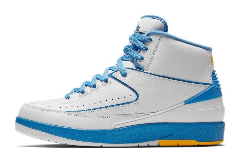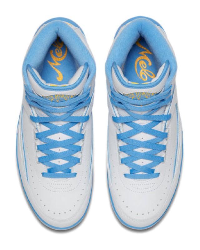This sneaker is the 2018 retro of the Air Jordan 2 Player Exclusive originally made for Carmelo Anthony during his early years with the Denver Nuggets. The design features a premium White leather upper with the signature lizard-textured side panel. The Nuggets' team colors are represented by bold University Blue accents on the piping, heel counter, and part of the outsole, contrasted by vibrant Varsity Maize (yellow) on the piping, outsole, and the tongue's Wings logo. The shoe includes unique details to honor the player, such as the number "15" (Melo's original jersey number) embroidered on the inside of the tongue and custom "Melo" branded insoles.