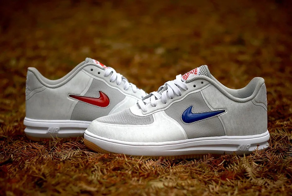 This shoe is a technical update to the Air Force 1 silhouette, built using Hyperfuse construction for a seamless, lightweight feel, and featuring a lightweight Lunarlon midsole (indicated by the Lunar abbreviation) for cushioning. The upper is made with a custom-developed, technical Loopwheeler cotton material, giving it a unique texture. The colorway is notable for its mismatched Swooshes: a University Red Swoosh on the right foot and a Game Royal (blue) Swoosh on the left foot, all on a Neutral Grey base.