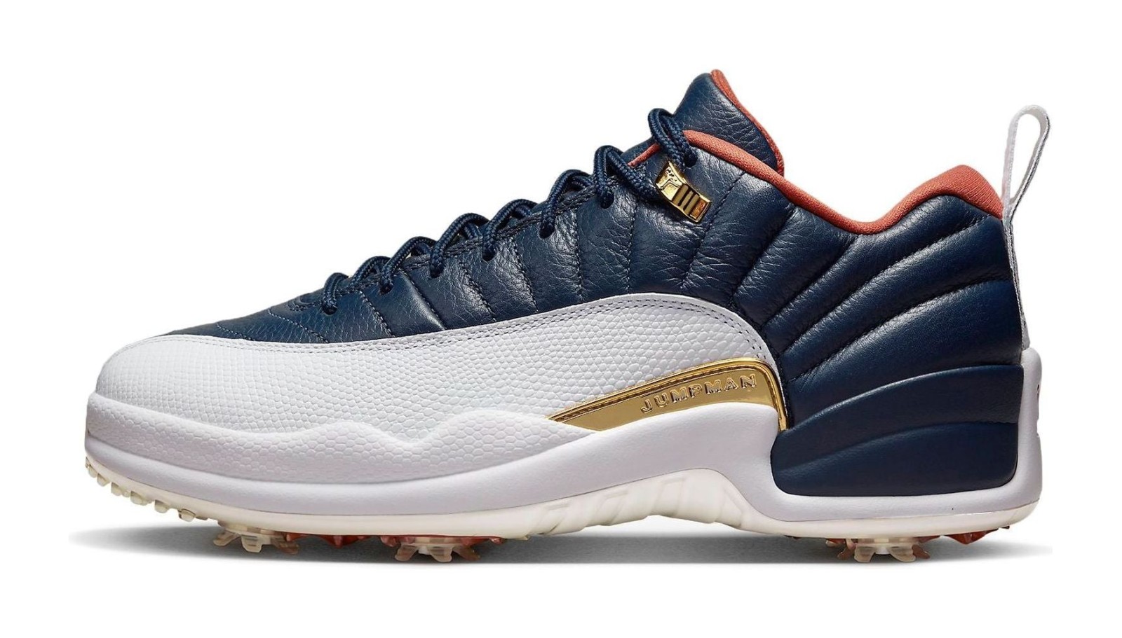 This golf version of the low-top Air Jordan 12 is a collaboration with Eastside Golf and is inspired by the theme "Out the Mud," symbolizing overcoming adversity. It features a Midnight Navy tumbled leather upper with a contrasting White, lizard-textured mudguard. Metallic Gold accents appear on the eyelets and the molded midfoot plate. The most distinct feature is the outsole, which has a hybrid design with integrated traction and removable spikes for the golf course, and incorporates a Burnt Sunrise (orange/red) color that symbolizes red clay mud. Eastside Golf branding is also found on the tongue and insoles.