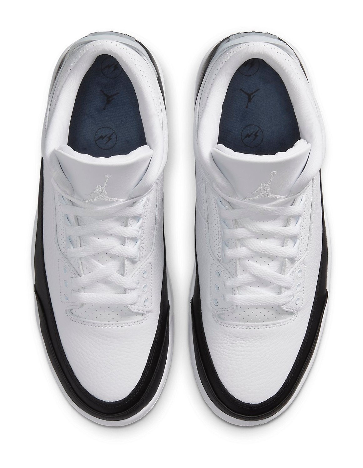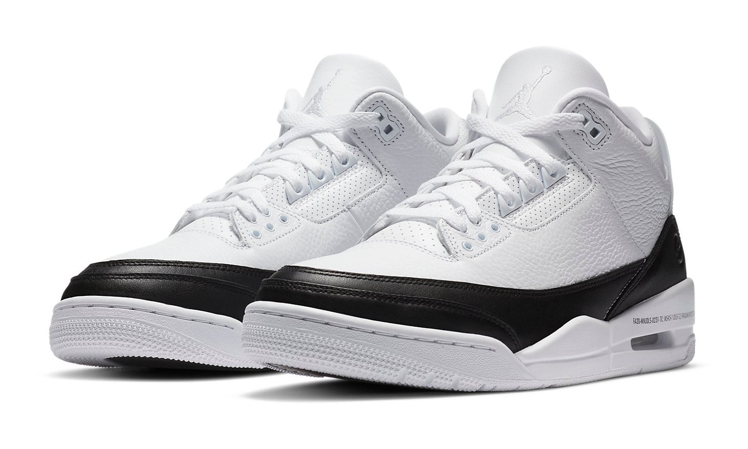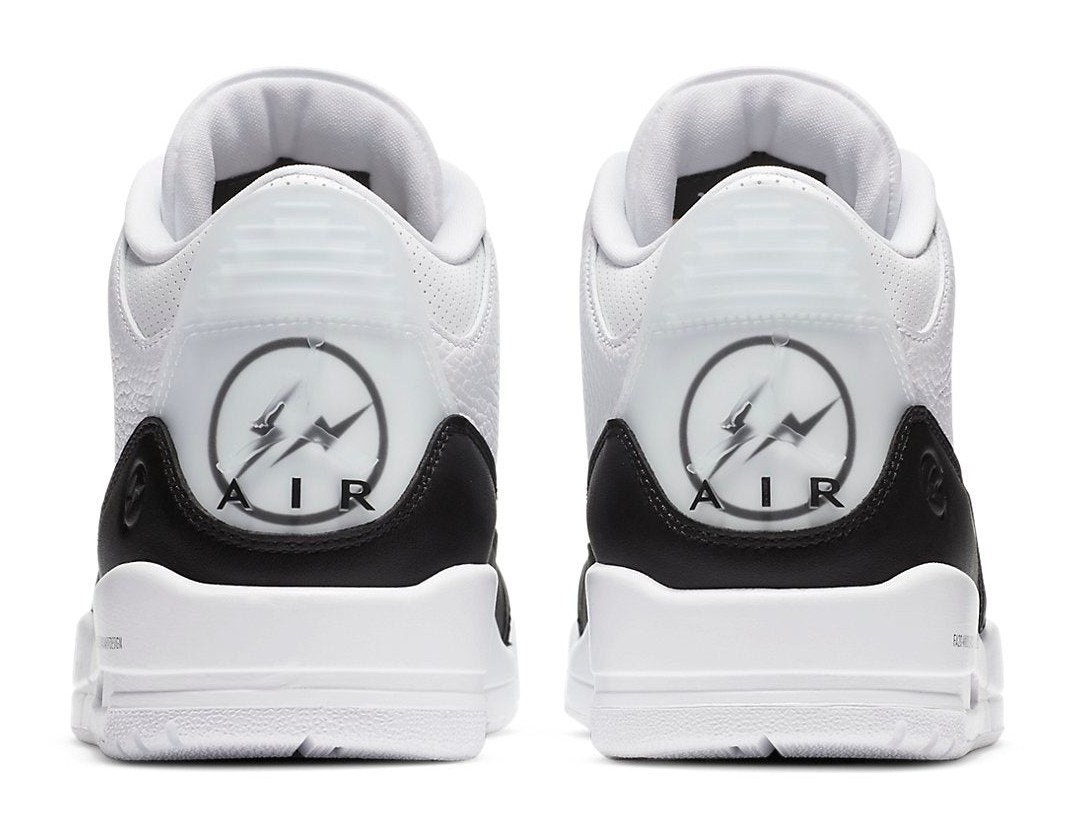The Fragment Design x Air Jordan 3 Retro SP is a highly coveted collaboration that applies Fragment founder Hiroshi Fujiwara's minimalist aesthetic to the classic Air Jordan 3 silhouette. The shoe features a clean, monochromatic look with a White tumbled leather upper. Instead of the traditional elephant print, the sneaker utilizes smooth, solid Black leather on the mudguard, heel, and toe overlays. Signature Fragment branding is kept subtle and technical, with the SKU number and text printed in black just above the midsole. The most unique detail is the translucent, molded heel tab, which features the embossed Jumpman logo layered over the Fragment Design double lightning bolt logo, which is printed in black on the underlying leather panel. This simple, two-tone colorway with premium materials and signature branding creates a sleek, high-end take on the retro basketball shoe.