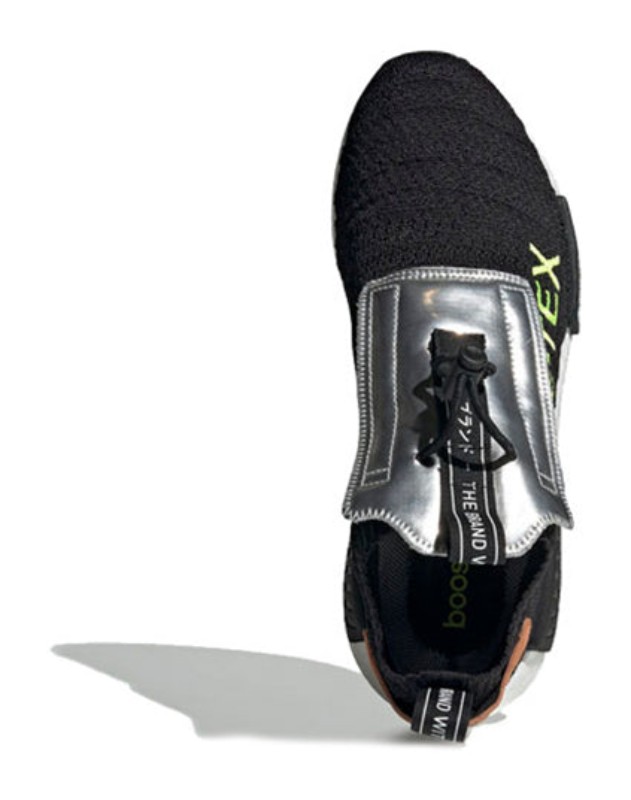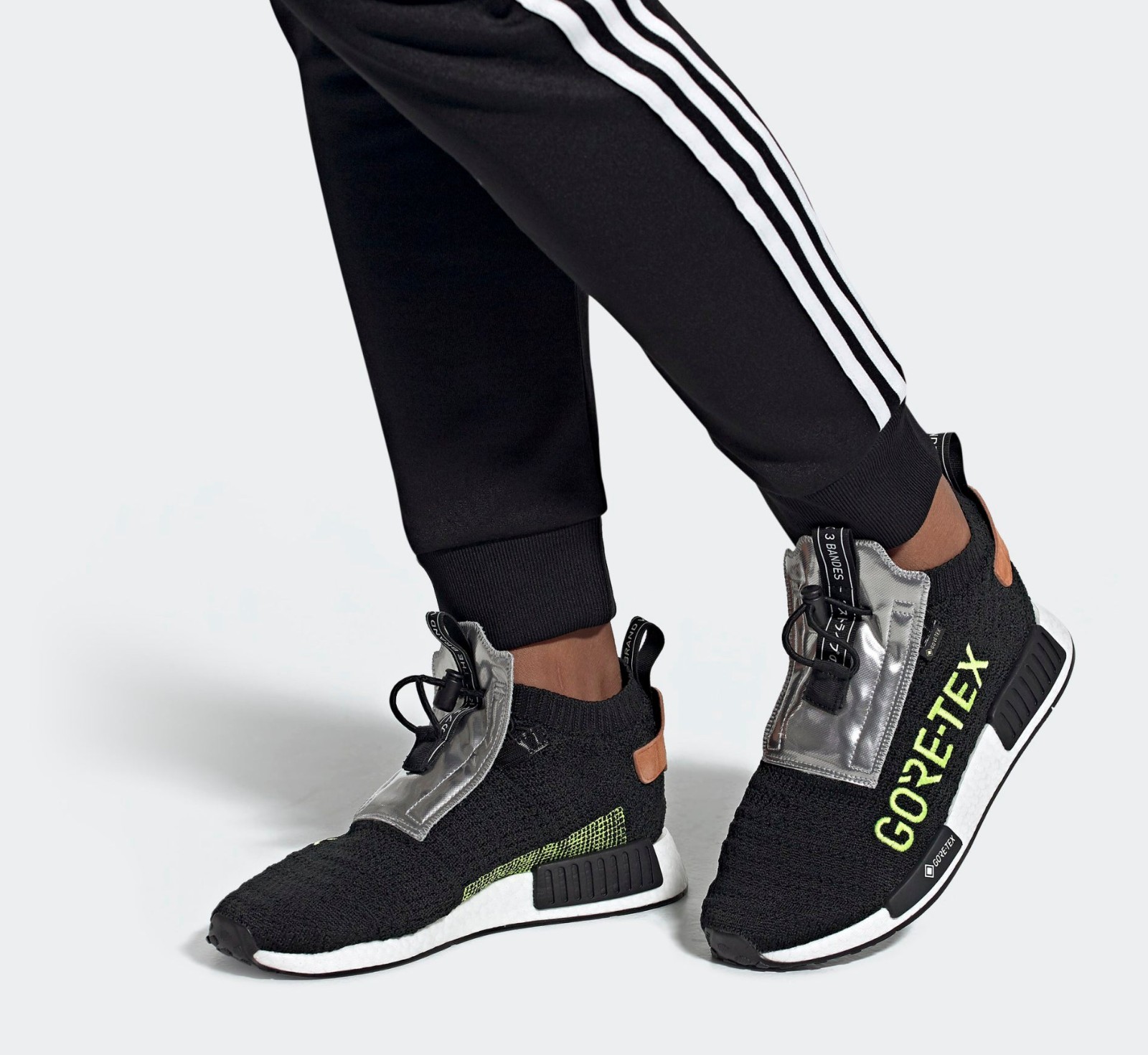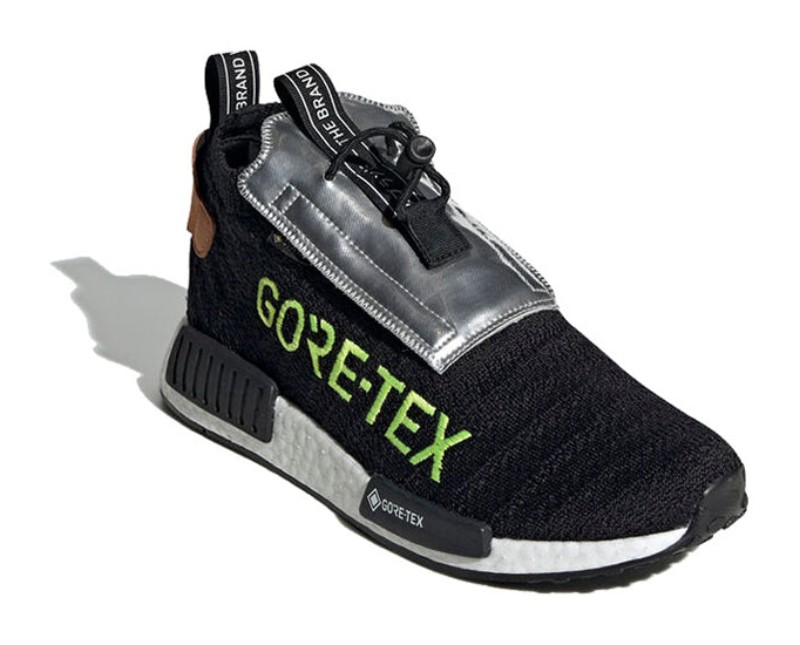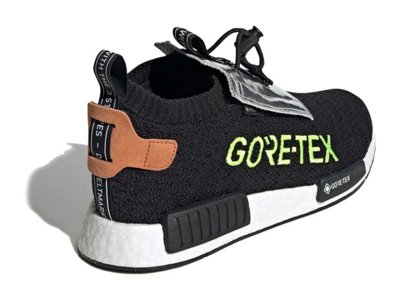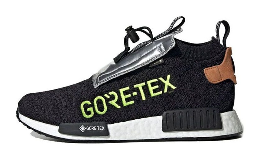 A sleek, all-weather version of the NMD_TS1, built with a sock-like Core Black Primeknit upper that is fully lined with GORE-TEX for waterproof protection. The shoe features a unique toggle-lace system and a protective fold-over tongue flap in silver. The design is almost fully blacked-out, except for key branding details, like the yellow GORE-TEX writing, adding a pop of visibility and technical flair to the otherwise "Core Black" upper and full-length white Boost midsole.