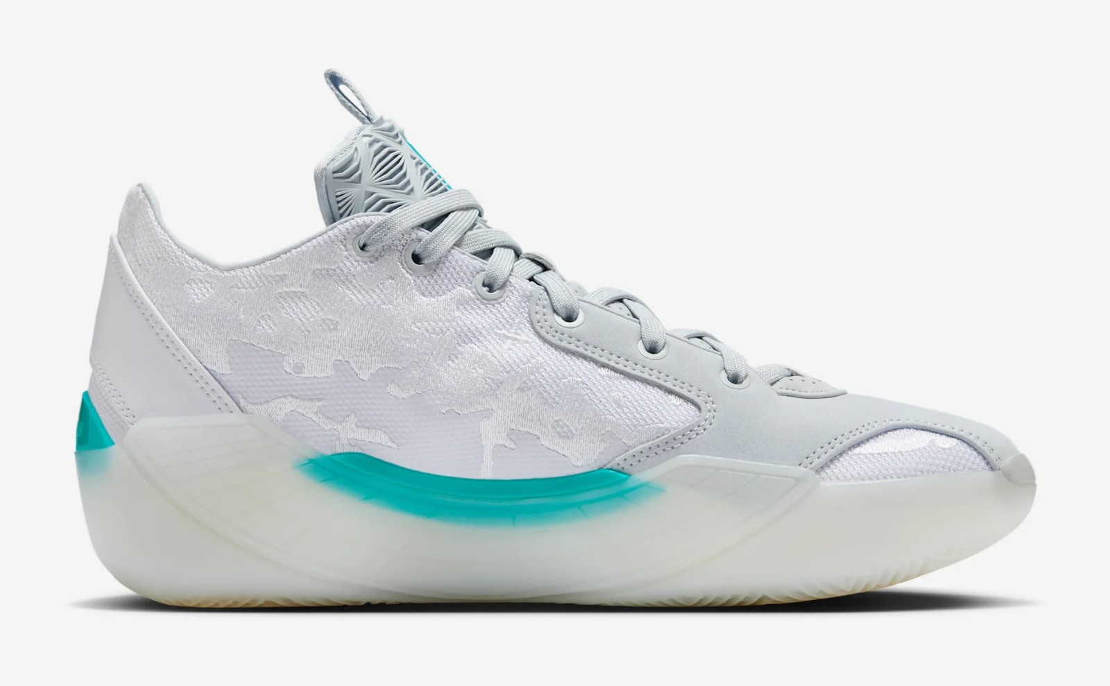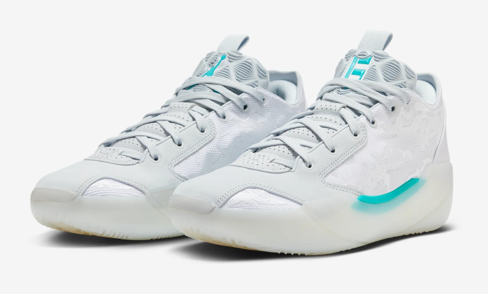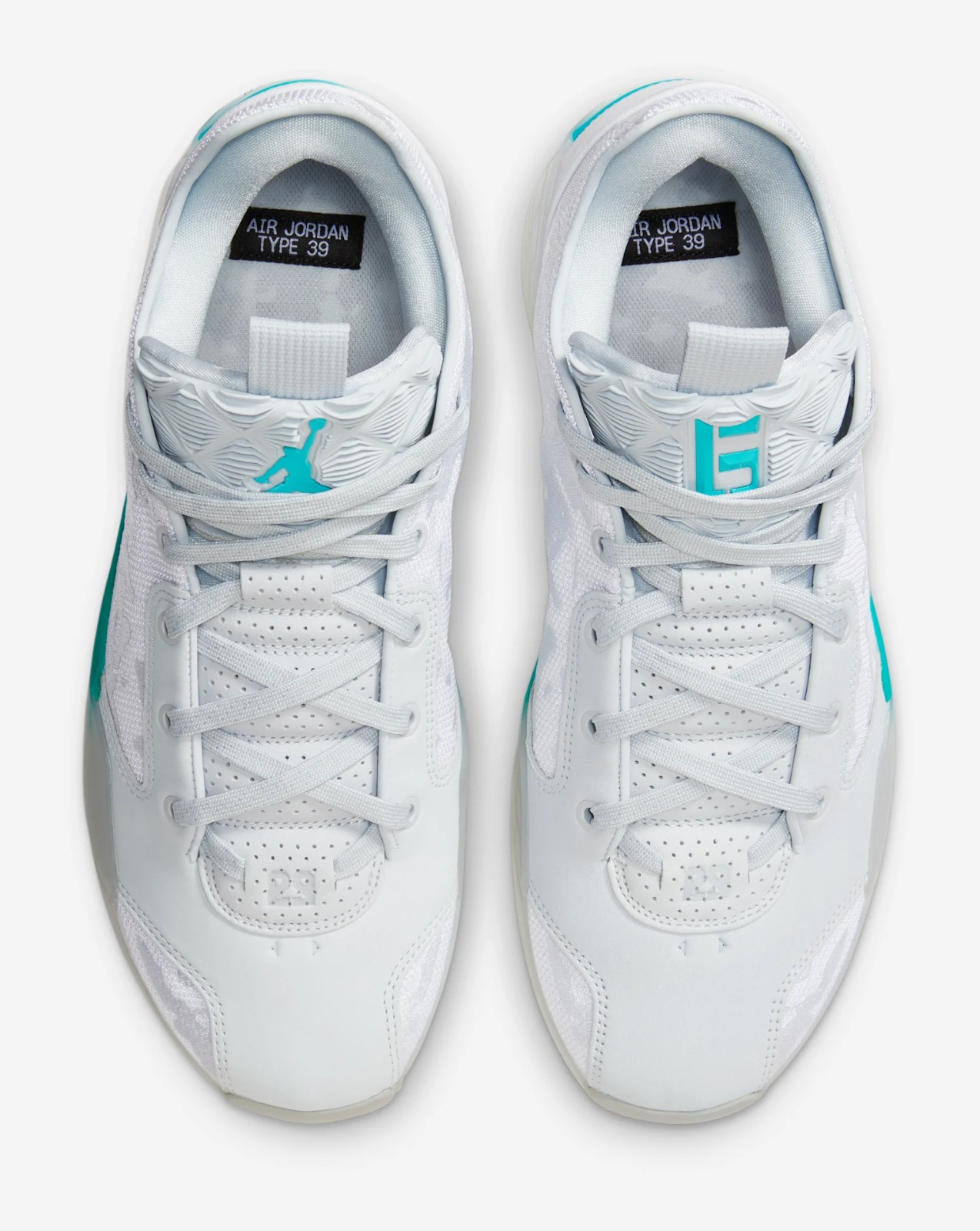 This is a Player Exclusive (PE) colorway for Chinese basketball star Guo Ailun. The shoe features a clean, high-performance look with a mostly White mesh and synthetic leather upper. Hyper Jade (a bright, greenish-blue) is the signature color, featured prominently on the midfoot shank, heel clip, and subtle accents like the trimming, giving the shoe a distinct pop. Pure Platinum (a light grey) is used for slight contrast on the upper. This model uses the Air Jordan 39's basketball-focused design and is built for performance.