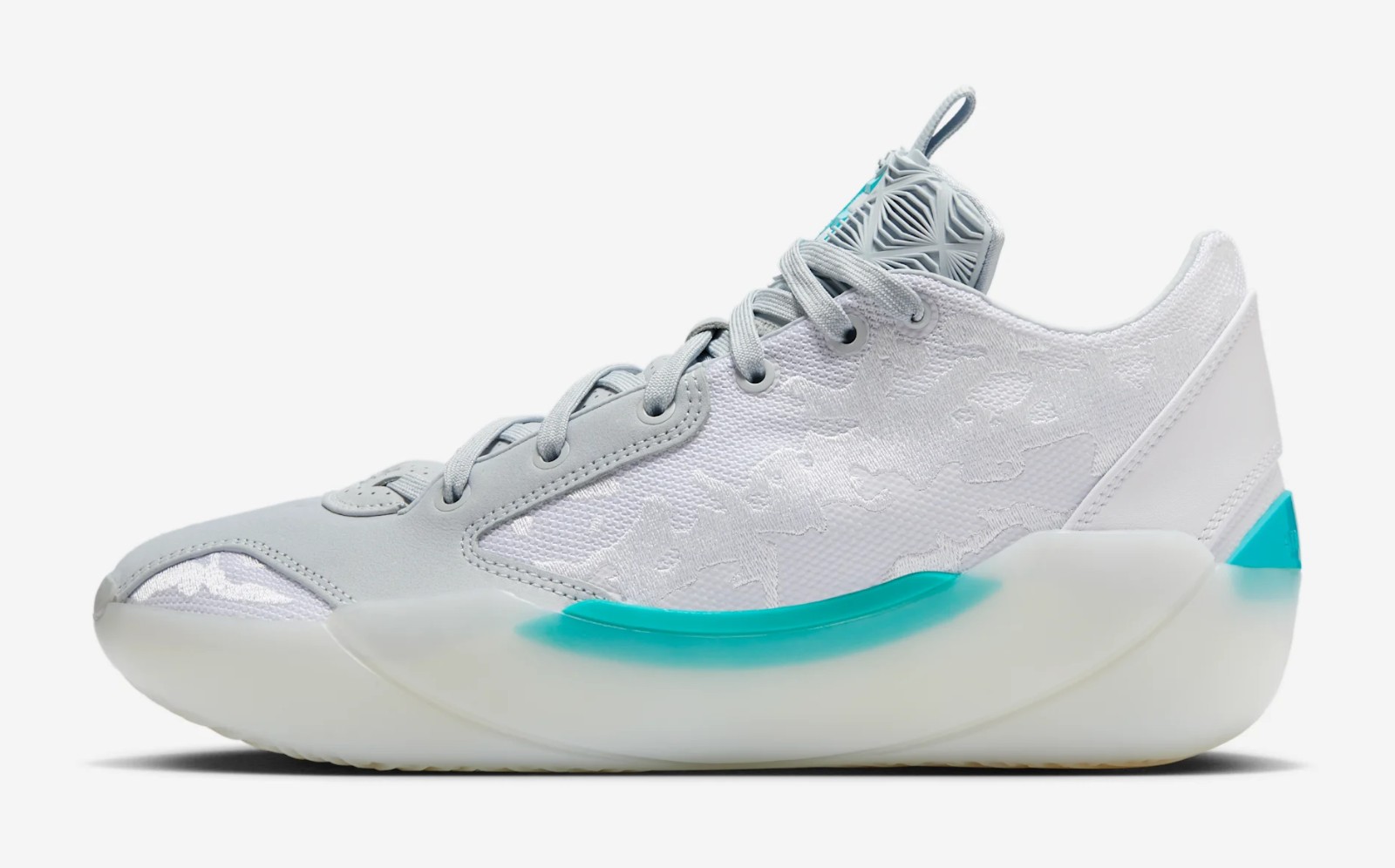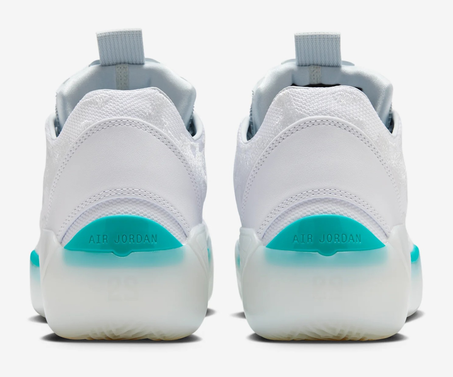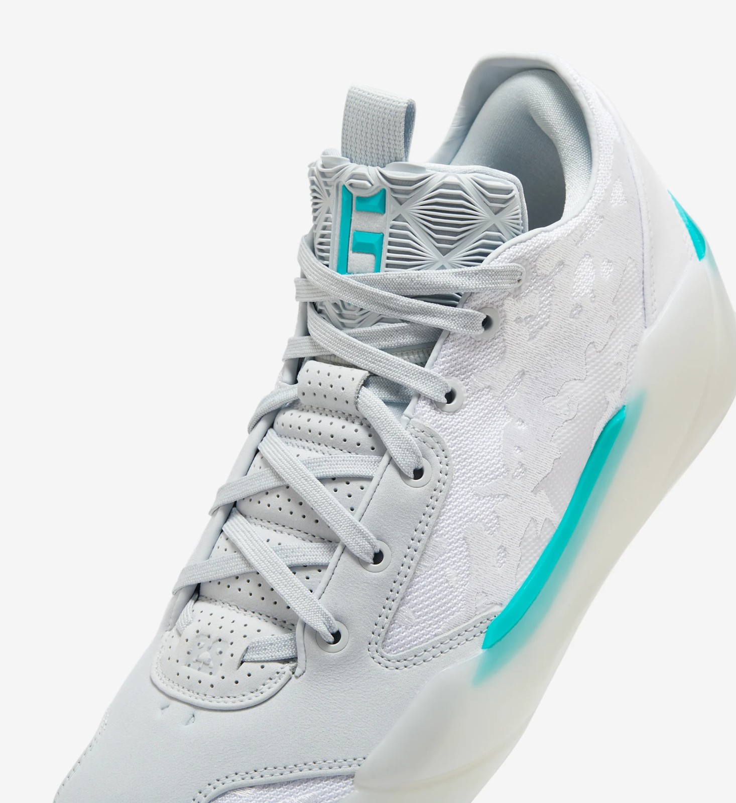 This is a Player Exclusive (PE) colorway for Chinese basketball star Guo Ailun. The shoe features a clean, high-performance look with a mostly White mesh and synthetic leather upper. Hyper Jade (a bright, greenish-blue) is the signature color, featured prominently on the midfoot shank, heel clip, and subtle accents like the trimming, giving the shoe a distinct pop. Pure Platinum (a light grey) is used for slight contrast on the upper. This model uses the Air Jordan 39's basketball-focused design and is built for performance.