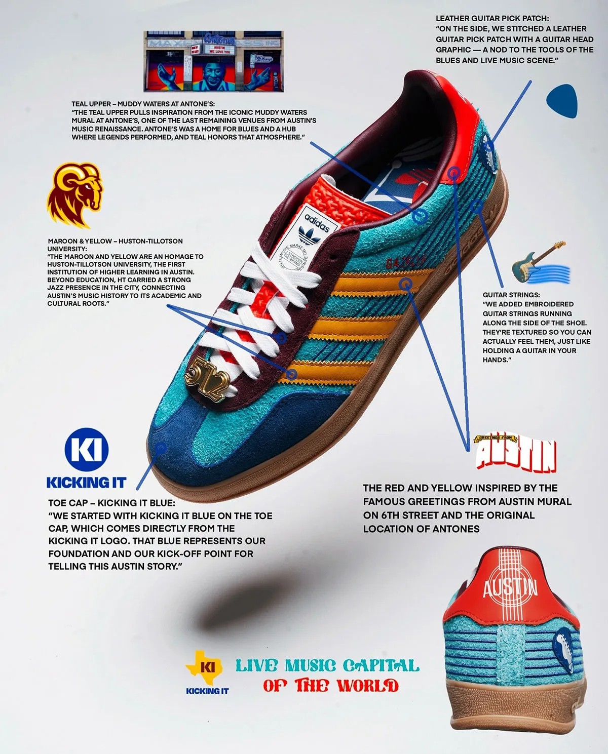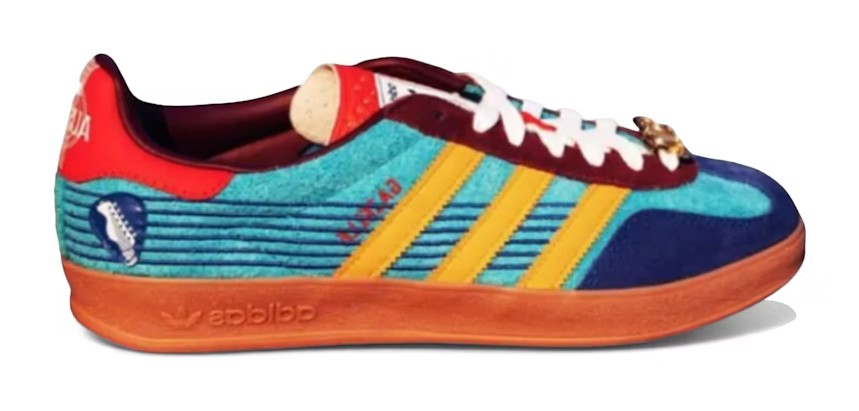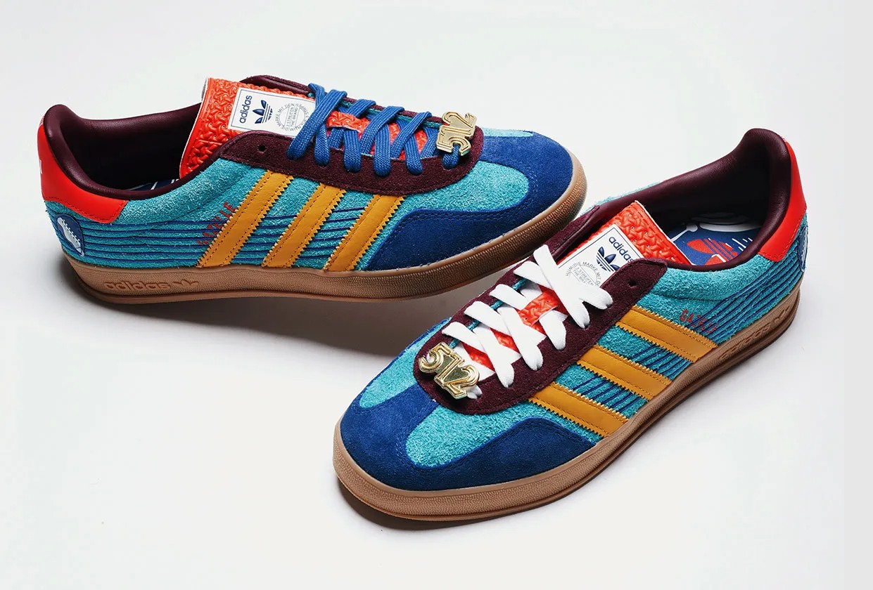 The sneaker is part of a special release that pays homage to Austin's rich blues and live music heritage. The shoe uses the classic Gazelle Indoor silhouette, which is a lifestyle model originally designed for indoor sports. The upper is constructed with suede in five shades of blue, accented by red and yellow details inspired by the iconic entrance of Antone's nightclub. A special '512' lace charm, which is the Austin area code, is included as a hometown touch.