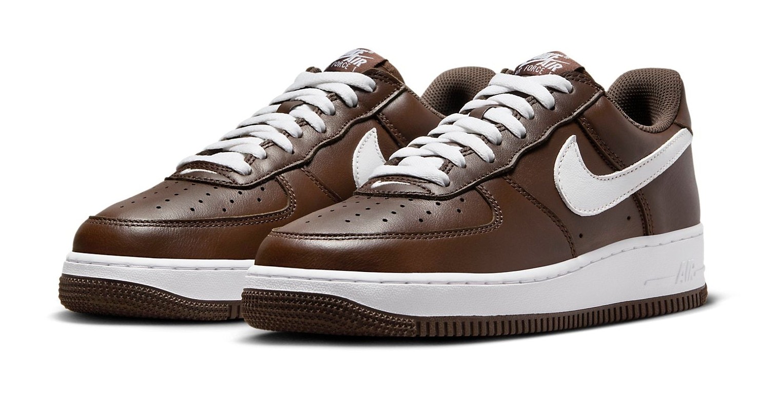 This sneaker features a retro look as part of the "Color of the Month" program, bringing back a classic, hoops-inspired colorway. The upper is dressed in a rich, smooth chocolate brown leather. White accents provide sharp contrast on the leather Swoosh logos, laces, tongue tag, and the Air-cushioned midsole. The look is completed with a brown rubber outsole. The design includes heritage details like the retro Nike Air branding on the heel.