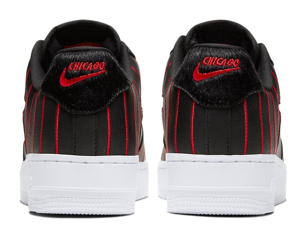 This women's exclusive Air Force 1 Low features a black leather upper inspired by the Chicago Bulls' pinstripe alternate uniforms from the late '90s, with University Red embroidered pinstripes across the overlays. It utilizes a glossy, molded "Jewel" Swoosh in matching red on the side panel. Unique details include a black pony-hair heel tab embroidered with "Chicago," speckled black and red rope laces, and a basketball-shaped metal lace deubré, all resting atop a classic, crisp white midsole.