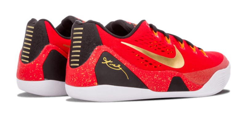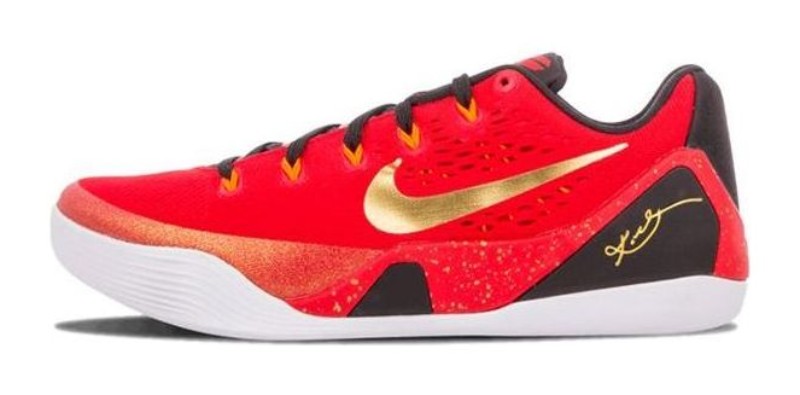 This sneaker was part of a series celebrating Kobe Bryant's connection with China. It features a bright red engineered mesh upper with metallic gold accents on the Swoosh and other details. The shoe sits on a black midsole and a red rubber outsole designed for extra durability on outdoor courts. It is equipped with a Lunarlon midsole and a rubber outsole with a traction pattern for grip.