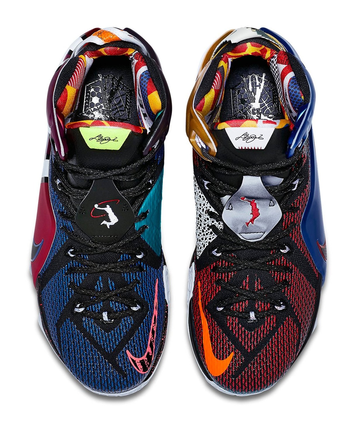 A high-top basketball sneaker that forms the signature "What The" mash-up, combining colors, graphics, and elements from various past LeBron models and other Nike heritage sneakers. The shoe features an asymmetrical, mismatched design across both the left and right shoe, utilizing a chaotic blend of colors (including red, blue, and white) and technical materials like Hyperposite overlays. The design pays homage to sneaker history with references like the "23" logo and Hot Lava splatter print.