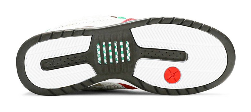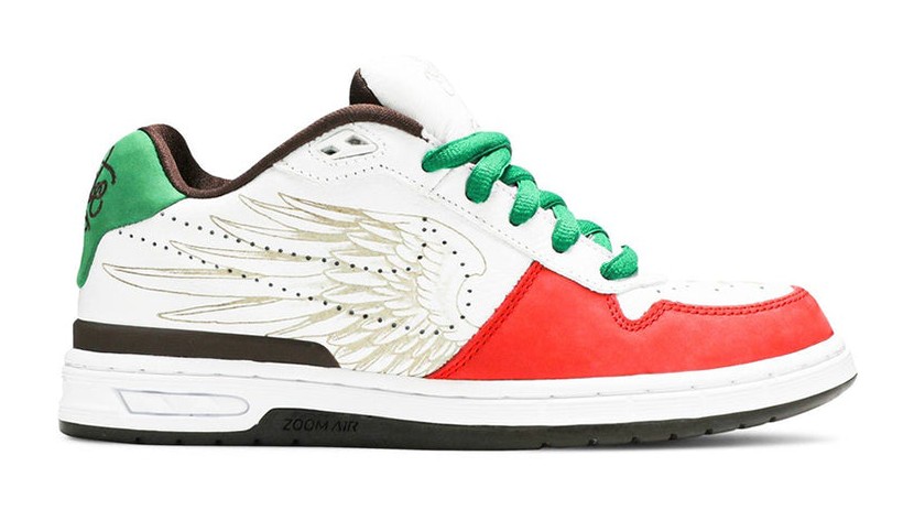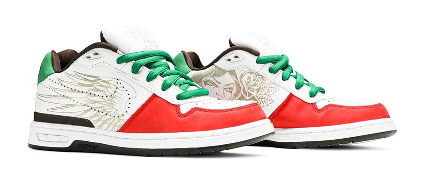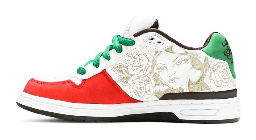 This highly collectible shoe pays tribute to Paul Rodriguez's Mexican heritage, inspired by the colors and themes of the Cinco De Mayo celebration and the Mexican flag. The shoe features a White leather upper with detailed, laser-etched Chicano-inspired graphics on the sidewalls. The colorway includes Sport Red accents and the national color Green on the heel tab, which is embroidered with the word "Fuertes" (meaning "Strong"). The shoe features mismatched tongue tags that read "Smile Now" and "Cry Later."