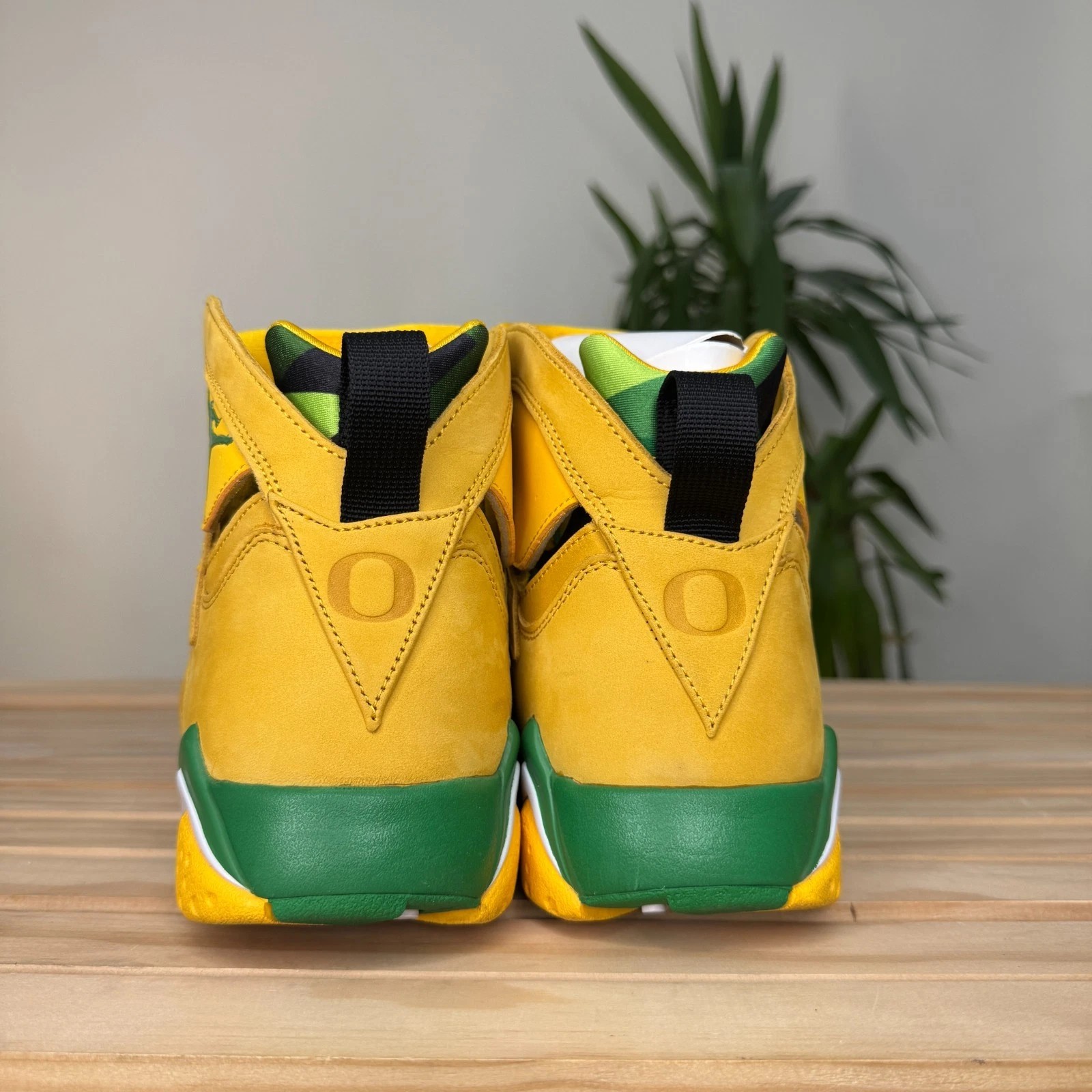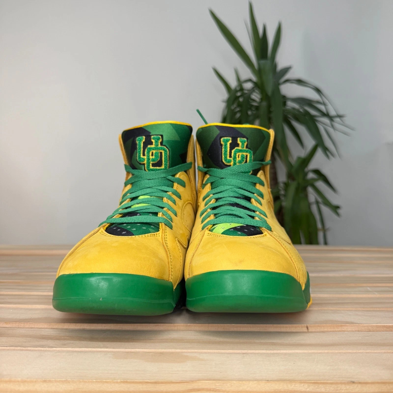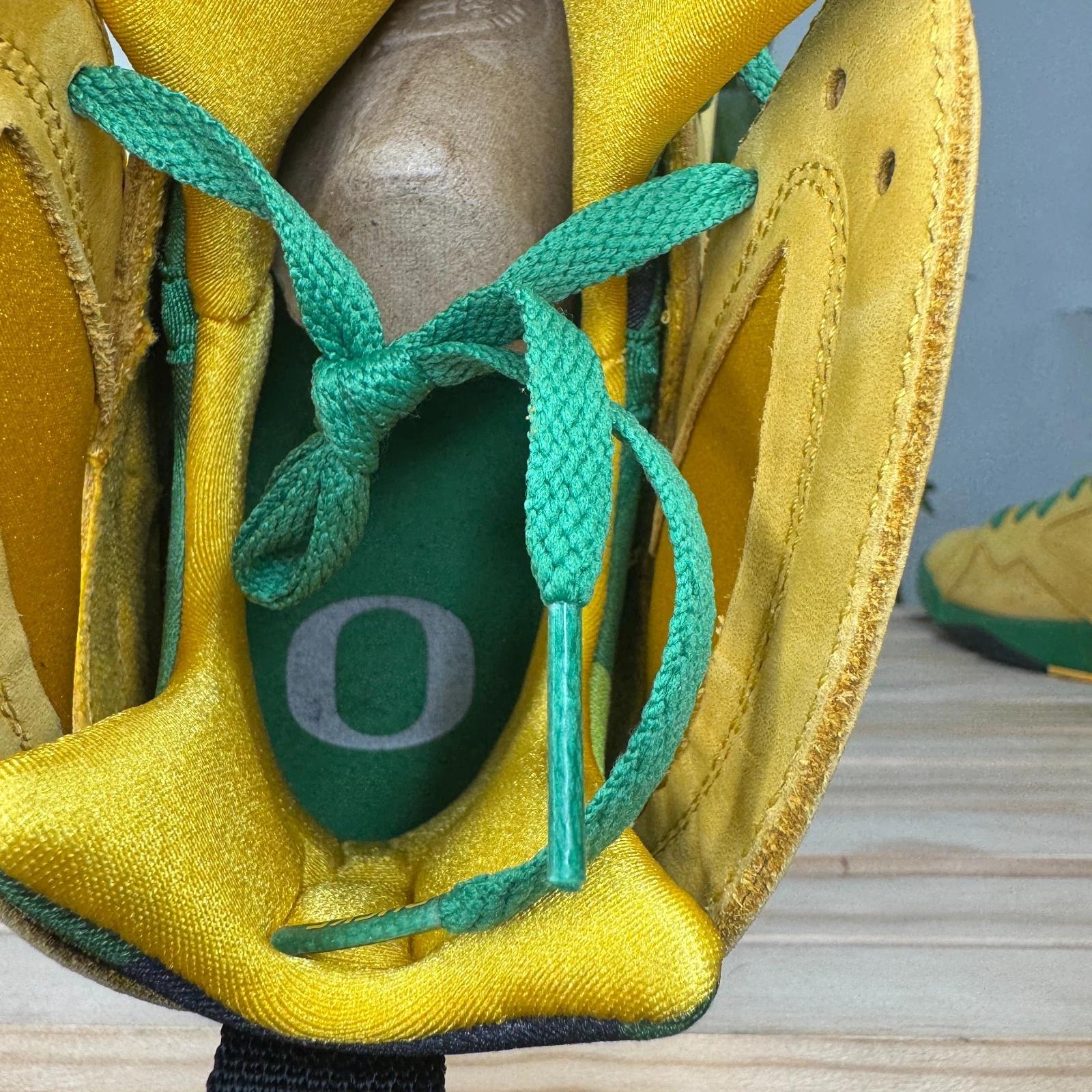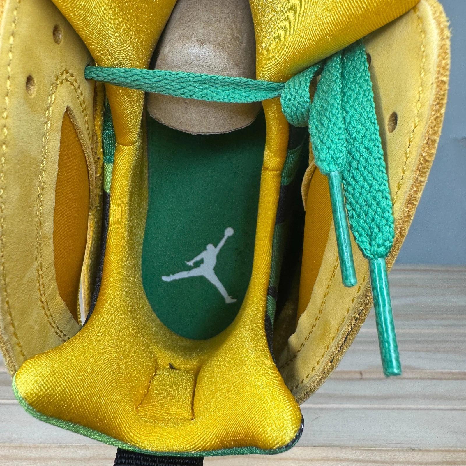 This shoe is an extremely rare Player Exclusive that features the signature colors of the University of Oregon Ducks: a bright yellow/green on the upper, accented with black details. The most notable feature is the inclusion of the school's "O" logo, often found on the heel in place of the standard Jumpman logo. These pairs are never sold at retail and are reserved for players and staff of the University of Oregon's athletic programs.