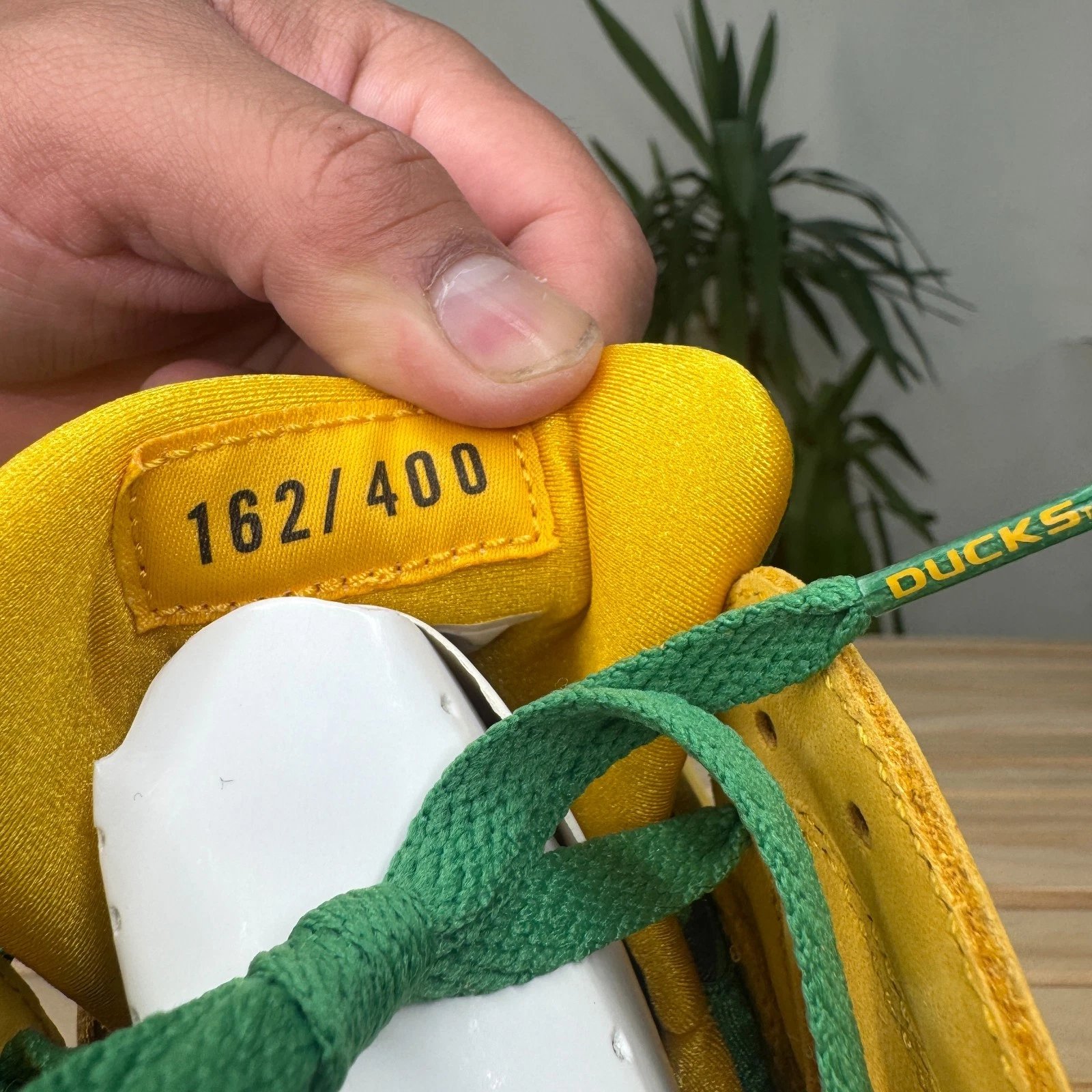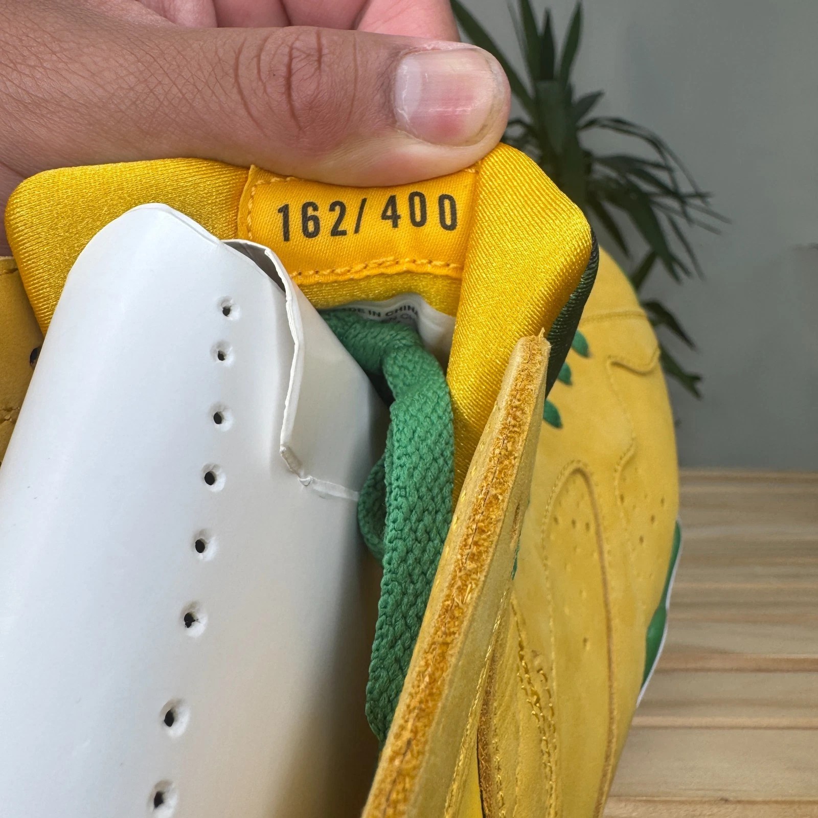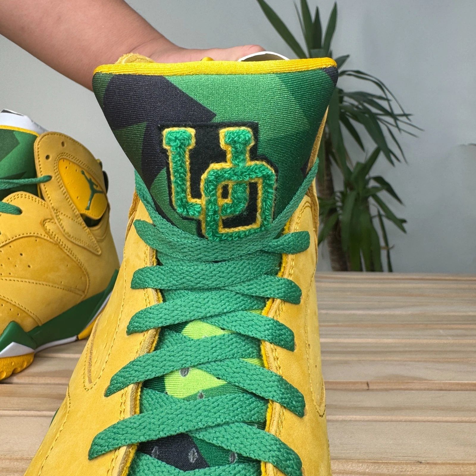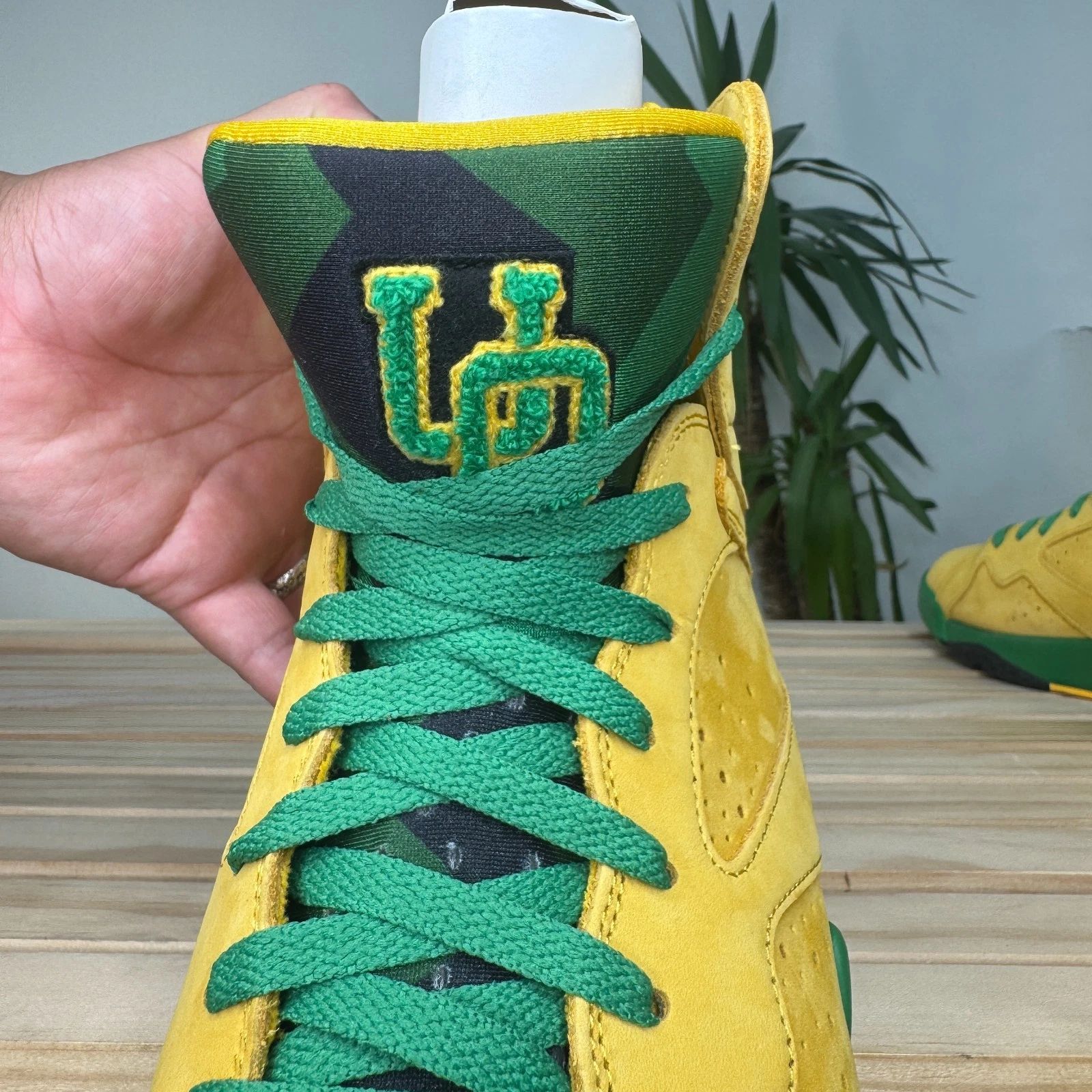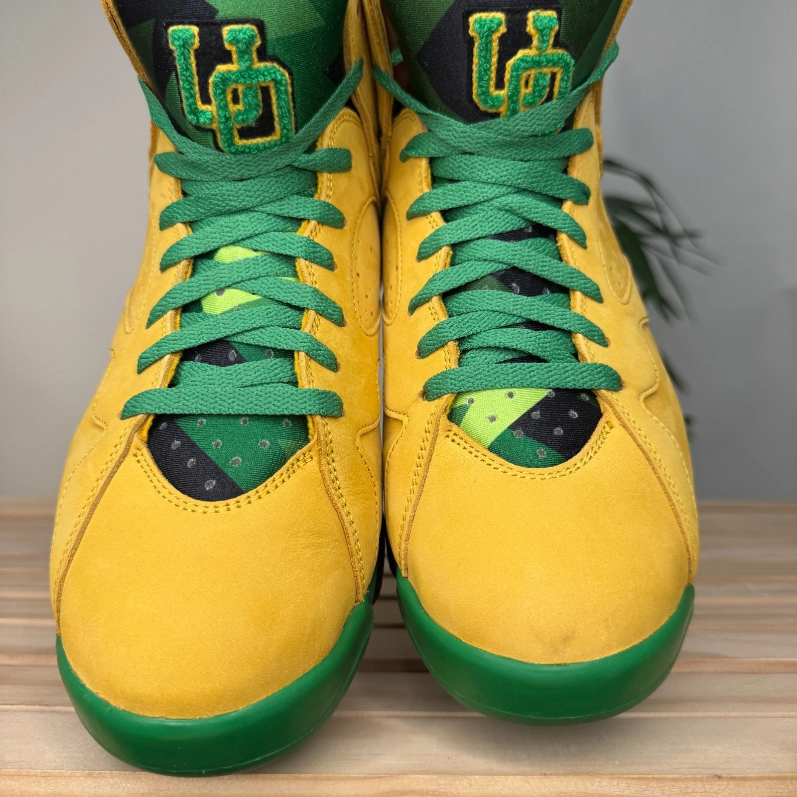 This shoe is an extremely rare Player Exclusive that features the signature colors of the University of Oregon Ducks: a bright yellow/green on the upper, accented with black details. The most notable feature is the inclusion of the school's "O" logo, often found on the heel in place of the standard Jumpman logo. These pairs are never sold at retail and are reserved for players and staff of the University of Oregon's athletic programs.