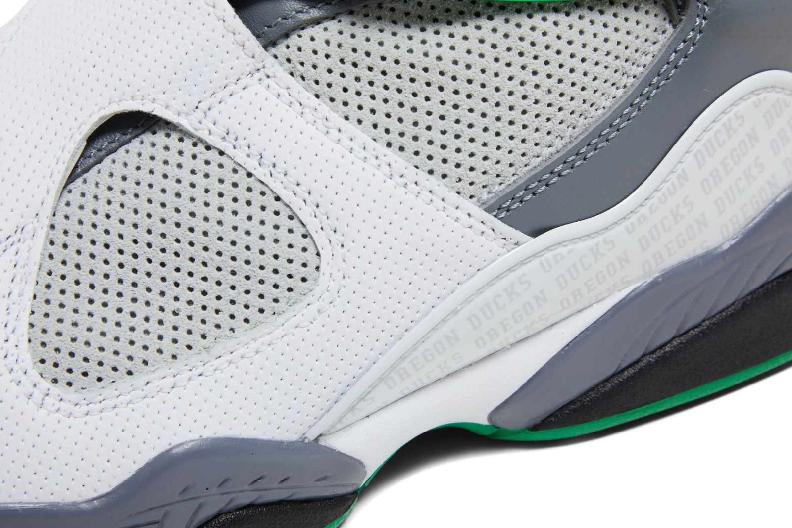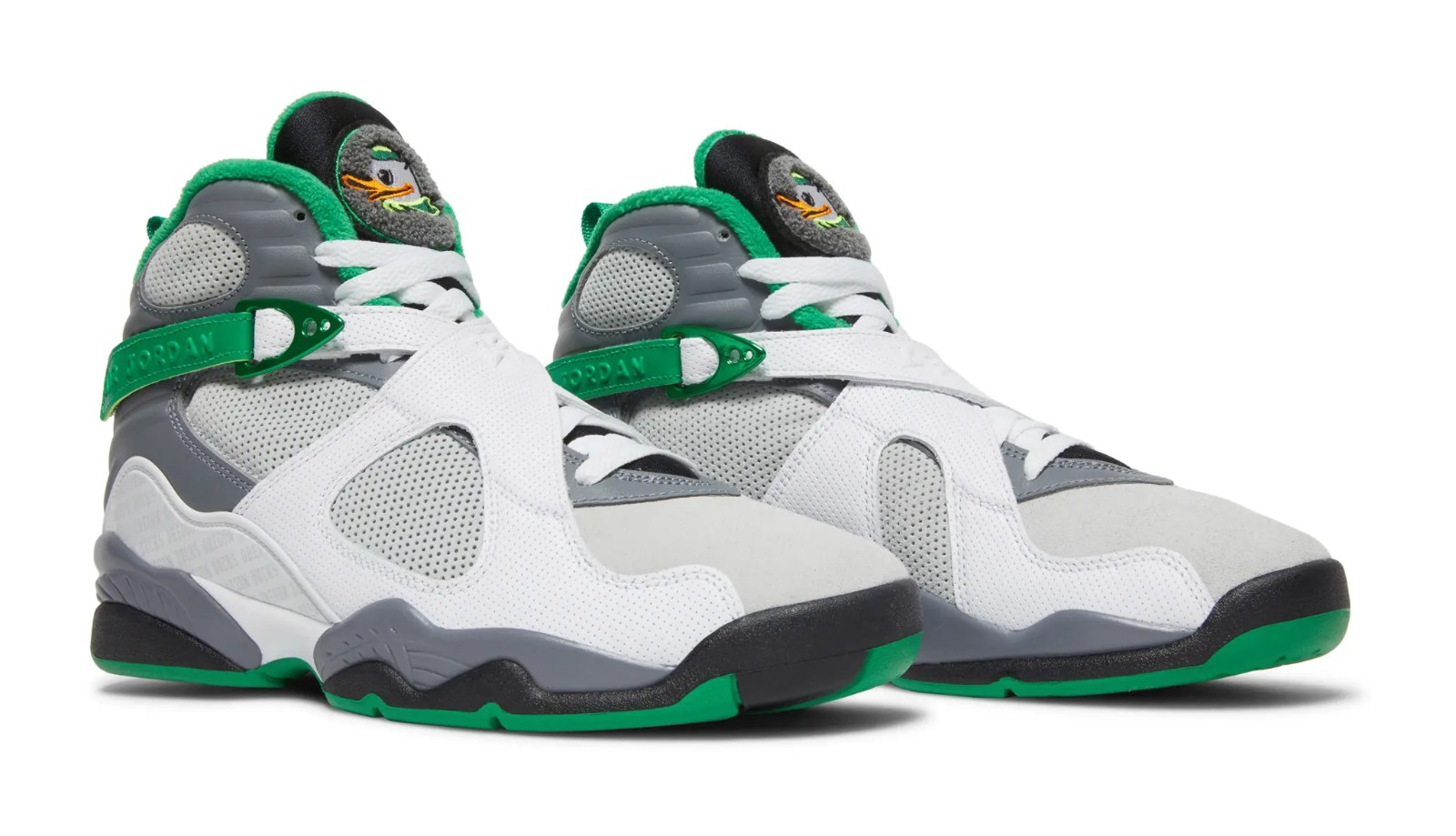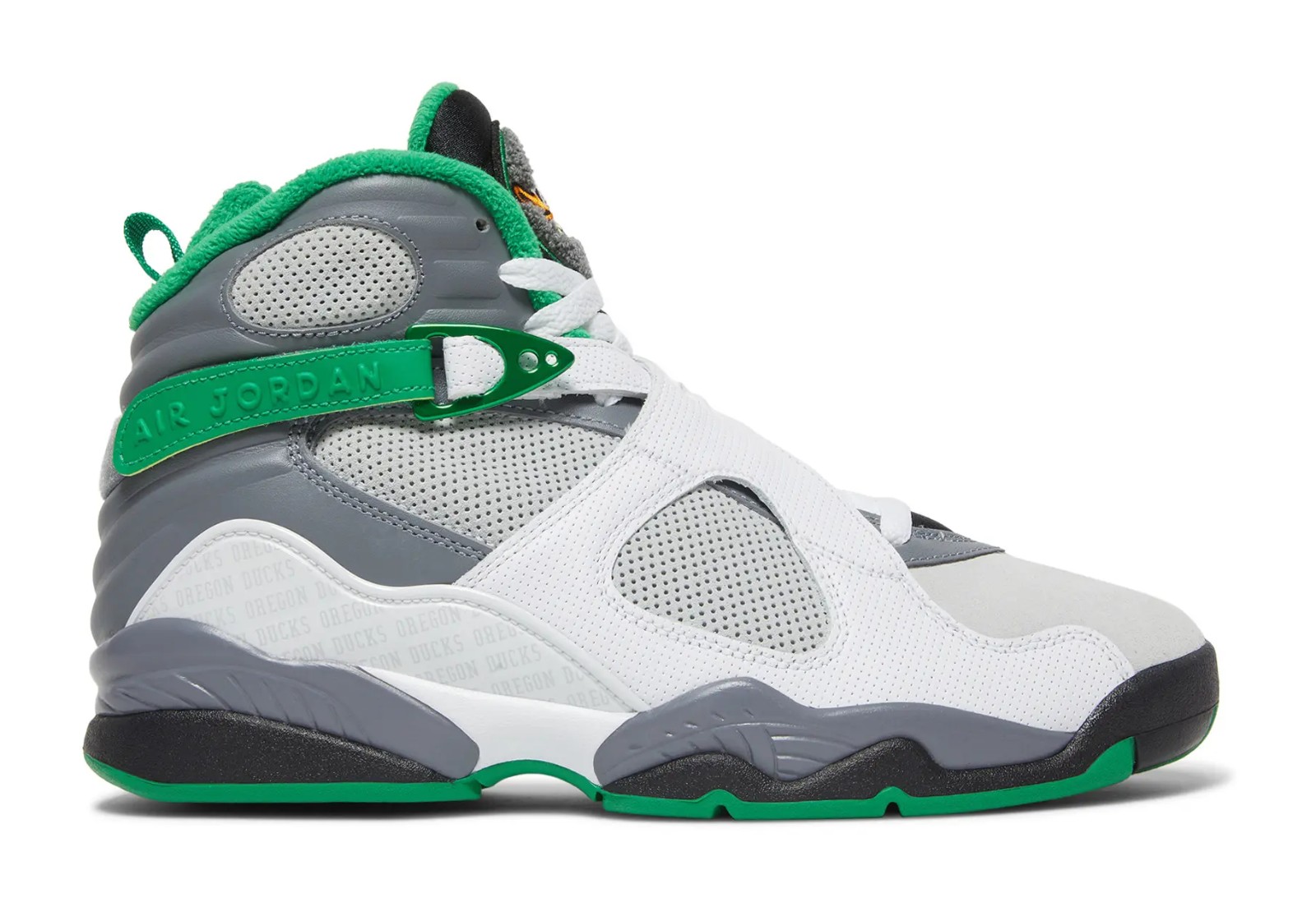 This shoe is a Player Exclusive (PE) colorway of the Air Jordan 8 created for athletes at the University of Oregon. It features a predominantly White leather upper with Pure Platinum (light grey) suede accents on the heel counter. The shoe incorporates the University of Oregon Ducks' school colors, most notably with Lucky Green accents. A key feature is the substitution of the standard Jumpman chenille patch on the tongue with a chenille patch featuring the Oregon Ducks' 'O' logo, and additional Oregon Ducks branding is visible on the reflective heel counter.