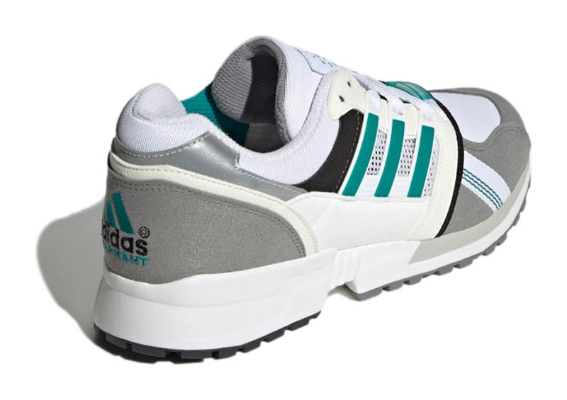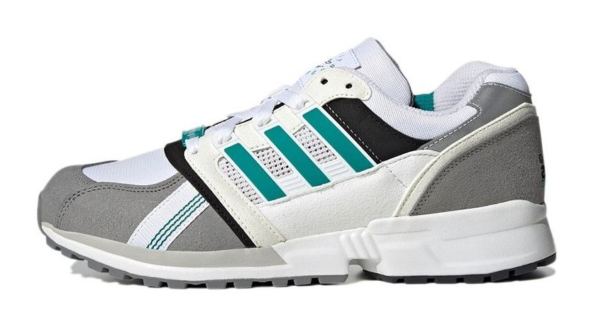The adidas EQT CSG 91 "30th Anniversary" (G58101) is a retro-inspired shoe that combines elements of multiple classic EQT runners in a colorway that pays tribute to the line's origins. The upper utilizes a mix of breathable mesh in Cloud White (an off-white/grey tone) and structured overlays of synthetic suede and leather in contrasting shades of grey and off-white. Core Black provides strong contrast on key structural areas. The shoe is instantly identifiable by the signature EQT color, a vibrant Equipment Green, which is used sparingly but effectively on the ribbon 3-Stripes (which are integrated into the lacing system) for example. The design is an homage to the clean, function-first aesthetics of the original 1990s Equipment footwear.