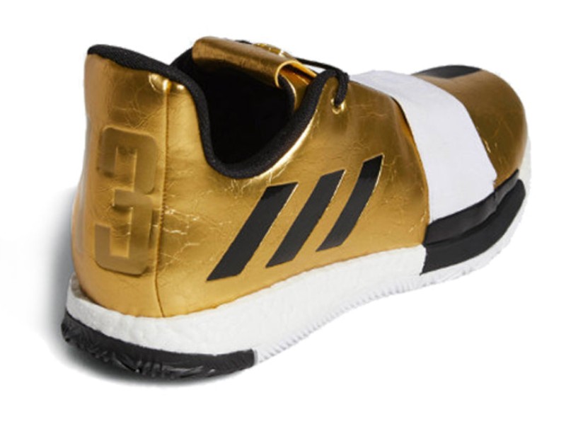 This basketball shoe celebrates the sentimental message "Imma Be A Star" that James Harden once wrote to his mother in high school. The upper is dominated by a luxurious, shimmering Metallic Gold colorway, symbolizing stardom and success. This metallic finish is contrasted with clean Footwear White and deep Core Black accents, seen on the Boost midsole, and three-stripes branding. The shoe is built with a lightweight upper and features responsive full-length Boost cushioning for explosive on-court performance.