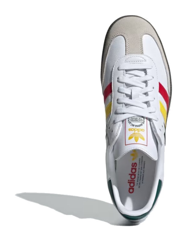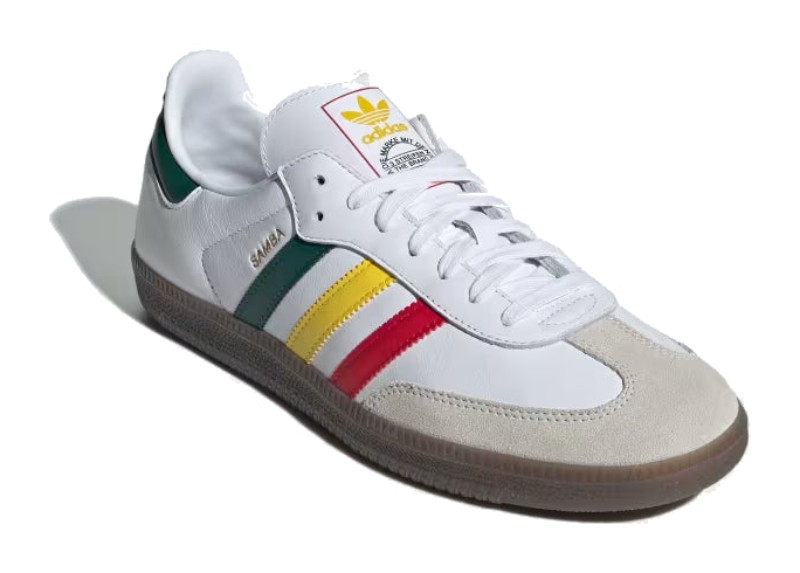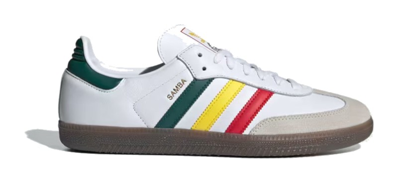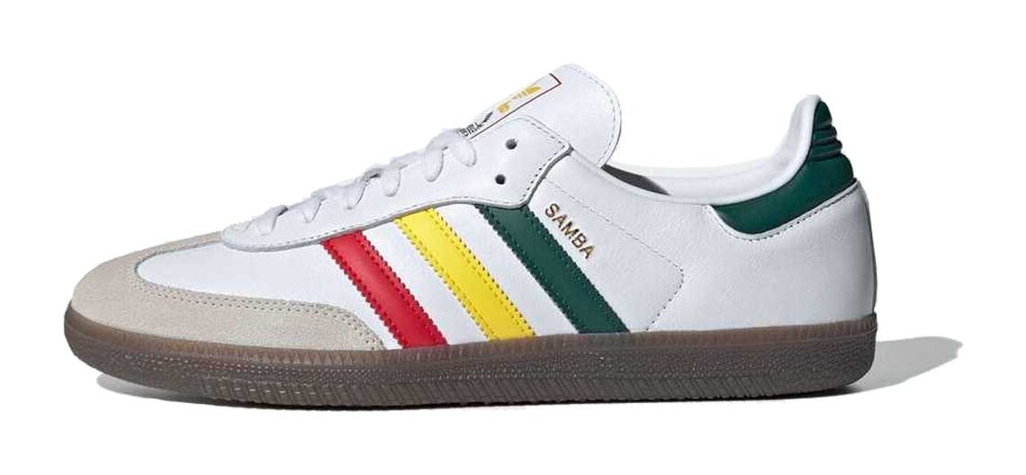 This Samba OG colorway draws inspiration from the Rastafari movement and Jamaican flag. The upper is constructed from a smooth Cloud White leather base with the classic grey suede T-toe panel. The vibrant colors of the Rasta flag—Yellow, Collegiate Green (darker green), and red—are featured on the Three-Stripes and the heel tab, with the tongue label also incorporating the bright palette. The shoe maintains the traditional gum rubber outsole.