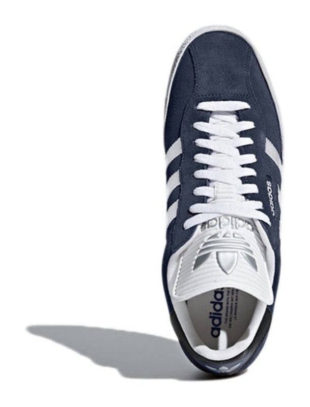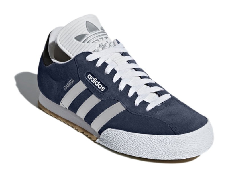 This classic-colored Samba Super features an upper constructed primarily from Collegiate Navy suede. The iconic serrated Three-Stripes and the heel tab provide a sharp contrast in Footwear White. The shoe retains the model's signature exaggerated tongue and sits on a non-marking Gum 3 rubber outsole, which features a cleat-inspired pattern, paying homage to the shoe's football heritage.