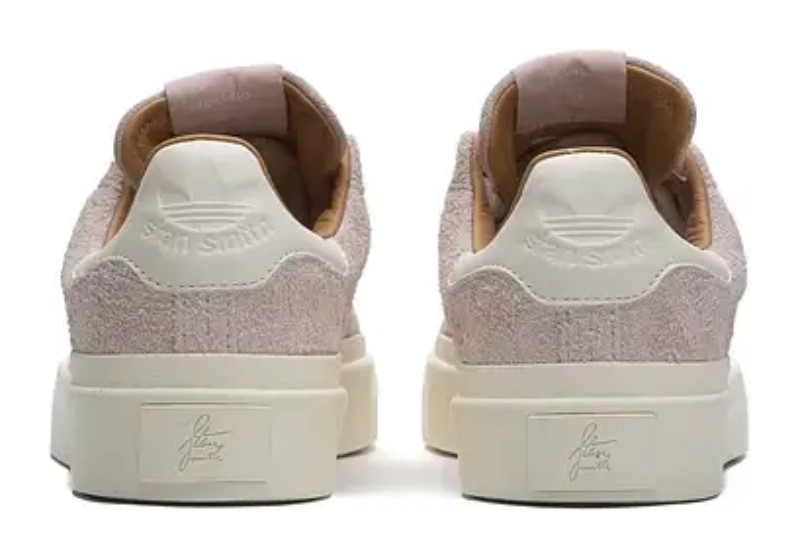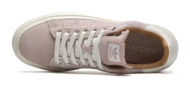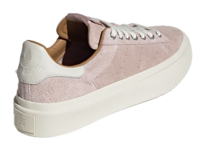 A modern interpretation of the classic Stan Smith, this shoe features a minimalist design with a soft suede upper in a light brown or "wonder taupe" color. It has a chunky off-white sole and a rubber foxing tape construction, distinguishing it from traditional Stan Smith models. The shoe includes a comfortable textile lining, perforated three-stripes, and a classic lace-up closure.