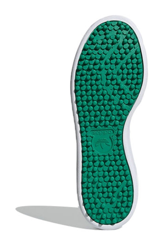 This golf version of the classic Stan Smith features a clean Cloud White upper constructed from Primegreen recycled materials. The iconic court aesthetic is maintained with the white base, perforated Three Stripes, and a contrasting Green heel tab. The key feature is the spikeless rubber outsole, which provides turf-friendly grip while keeping the flat, classic look of the tennis shoe silhouette, making it an environmentally-conscious, versatile golf shoe.