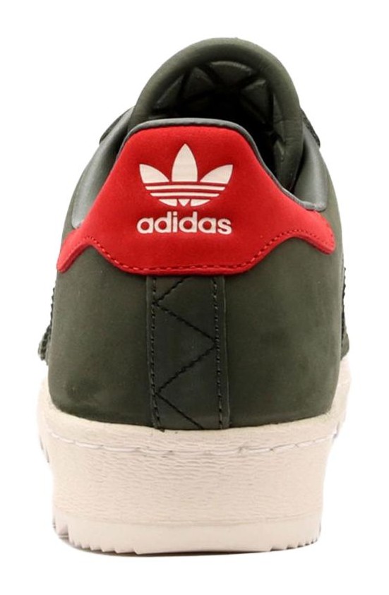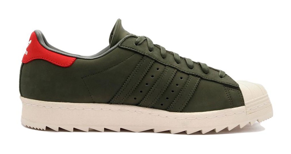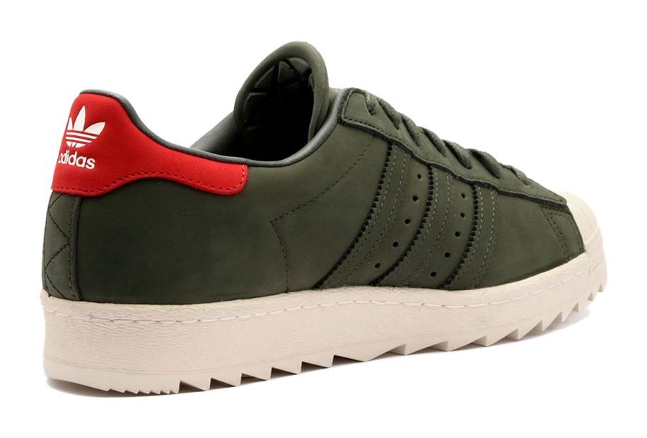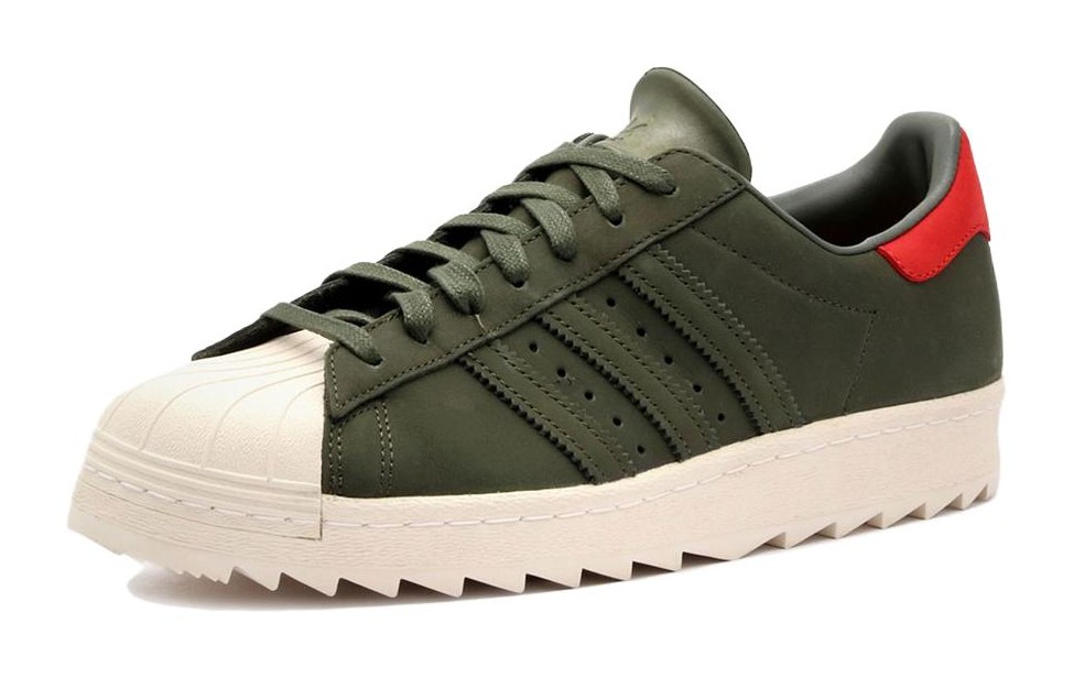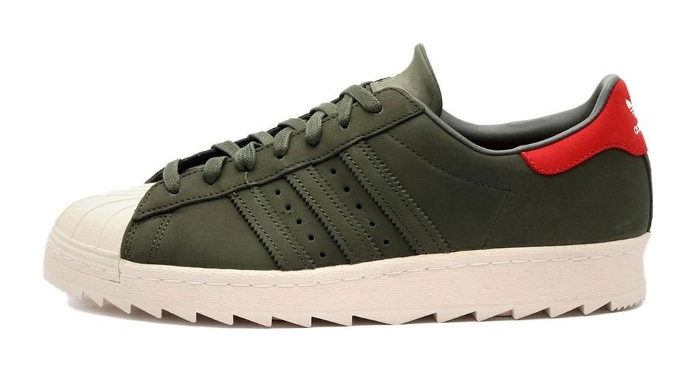 This shoe takes the classic Superstar silhouette and beefs it up for the outdoors. The upper is constructed primarily from a premium, durable suede in a uniform "Night Cargo," a deep, dark green. The iconic shell toe and rubber cupsole maintain their "Off White" color for contrast. Key "Trail" features include heavy-duty metal eyelets for the laces and an aggressive, lugged rubber outsole for superior traction in various outdoor conditions.