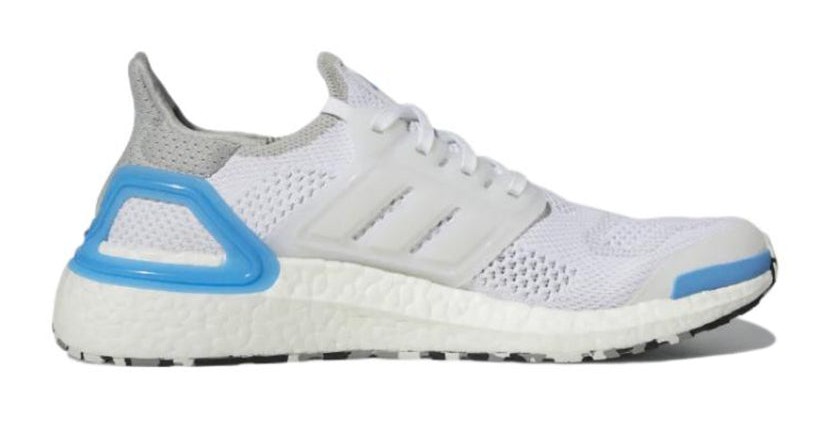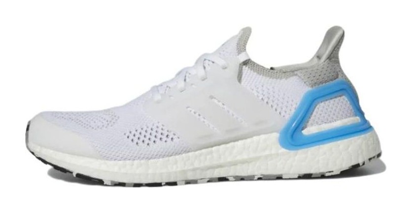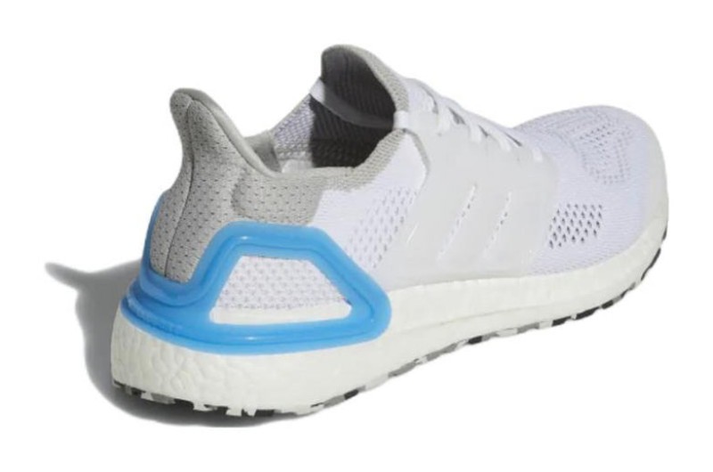 This UltraBOOST DNA model features a clean, predominantly Cloud White color scheme on the breathable Primeknit upper, cage, and full-length BOOST midsole. The minimalist white base is contrasted by subtle pops of Pulse Blue, most notably around the heel counter's accent color and small details woven into the knit. It is a sleek, everyday casual sneaker that offers classic running comfort in a bright, versatile colorway.