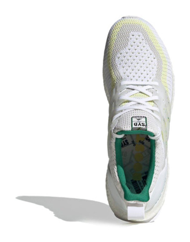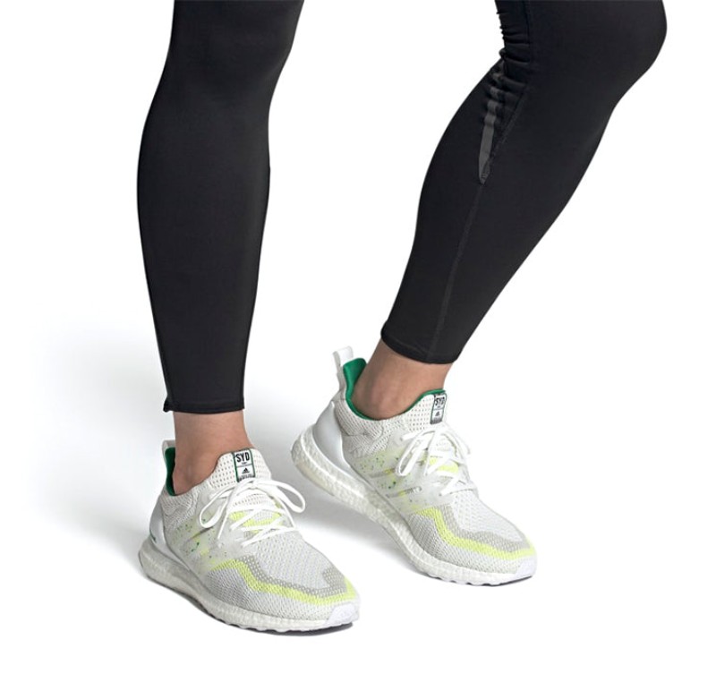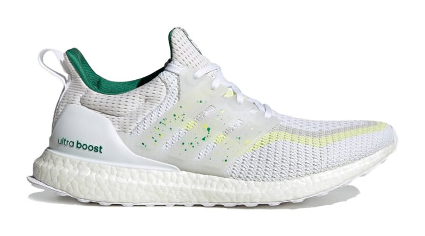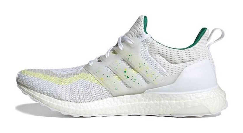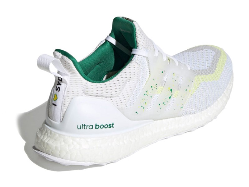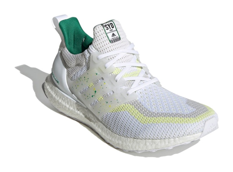 This is the Sydney entry in the Ultra Boost City Pack. It features a Primeknit upper predominantly in "Cloud White," serving as a neutral base for the vibrant city-themed accents. The colorful details in "Bold Green" and "Bright Yellow" add a striking counterpart. It utilizes the signature full-length white Boost midsole for cushioning and a Stretchweb outsole with Continental Rubber for reliable grip.