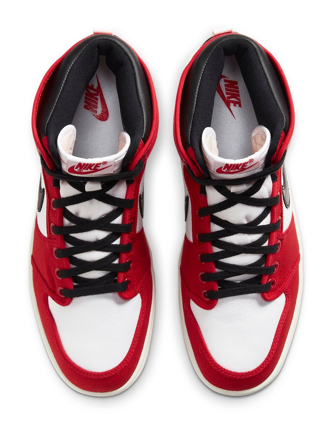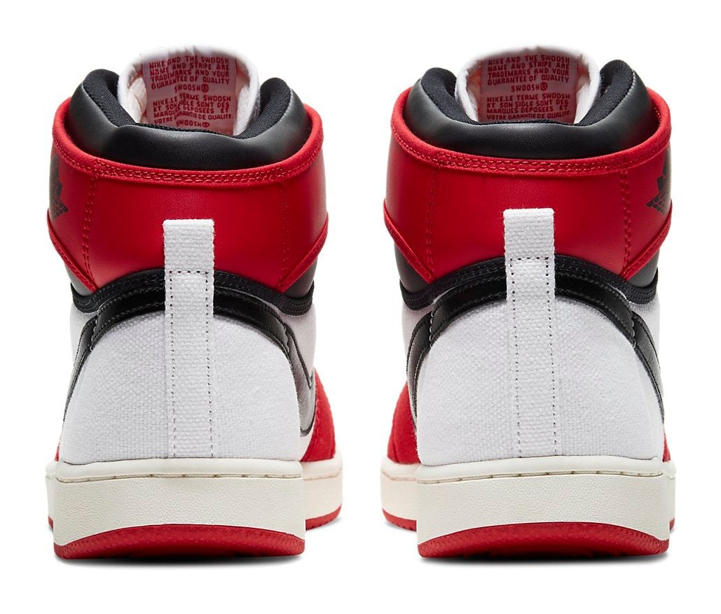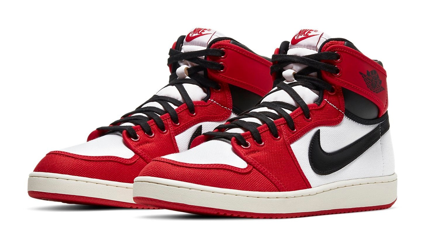 This high-top shoe from the Jordan Brand is a 2021 retro of the original AJKO model, which is notable for its primarily canvas construction. It utilizes the classic "Chicago" colorway, featuring a White canvas base with University Red canvas overlays on the toe, eyestays, and ankle collar. It contrasts the canvas with smooth Black leather on the Swoosh and the top of the ankle collar. The traditional Air Jordan Wings logo on the ankle is replaced with the AJKO branding. A white midsole and a University Red rubber outsole complete the heritage look.