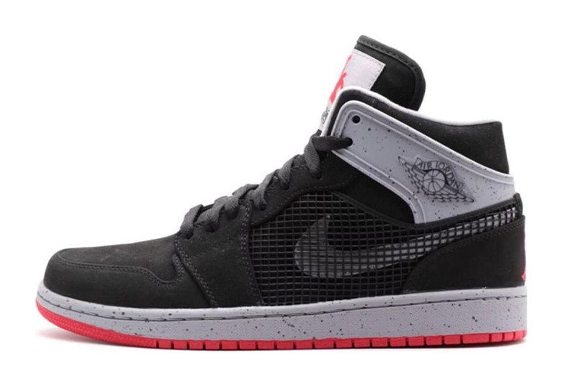 This hybrid model combines the silhouette of the Air Jordan 1 with iconic design elements from the Air Jordan 4, the model originally released in 1989 (hence the '89 suffix), and features the famed "Black Cement" colorway. The upper is predominantly Black, but features the distinctive Cement Grey elephant print on the plastic wings that replace the traditional ankle collar overlay. The mesh netting from the AJ4 appears on the quarter panels and tongue, replacing the typical AJ1 leather. Fire Red accents are used on the tongue lining and the Jumpman logo. The sole unit is that of the Air Jordan 1, completing the fusion design.