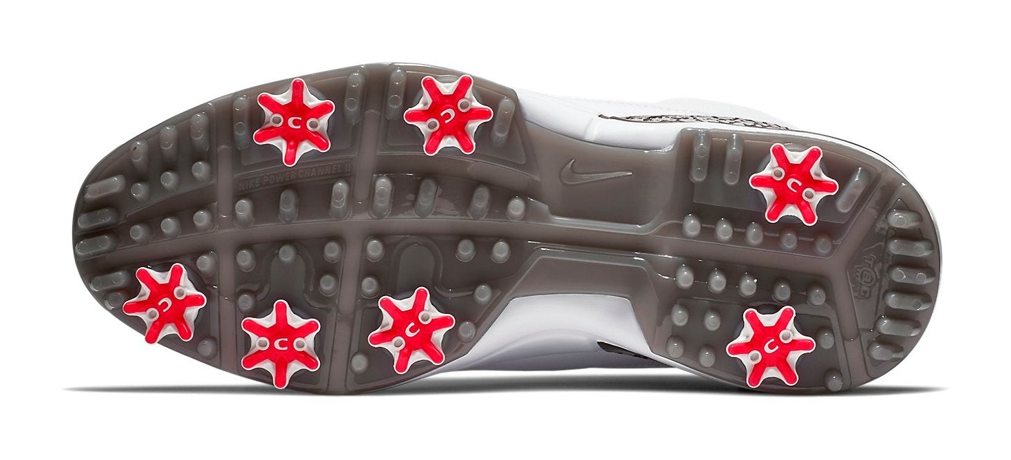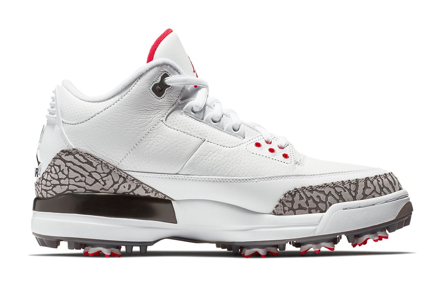 The Air Jordan 3 Retro Golf 'White Cement' brings the iconic basketball silhouette and colorway to the golf course. It features an upper made of crisp White leather, with the famous Cement Grey elephant print wrapping around the toe and heel. Black accents are used on the midsole and collar, while a touch of Fire Red is found on the Jumpman logo and lower eyelets, staying true to the original 1988 design. The sneaker is adapted for the links with a full-length Lunarlon midsole for comfortable cushioning and a specialized outsole that includes both removable spikes and integrated traction for optimal grip on the golf course.
