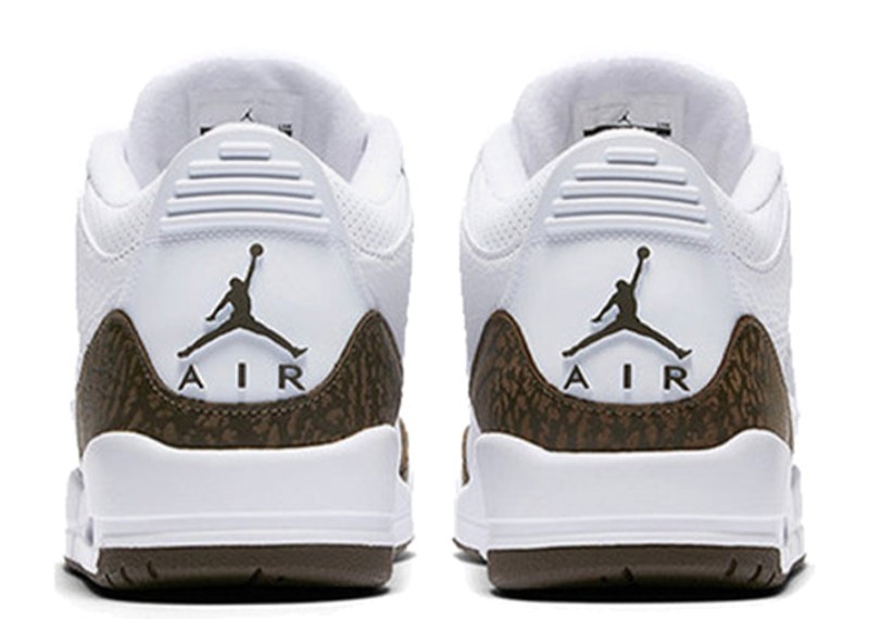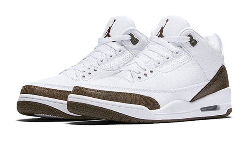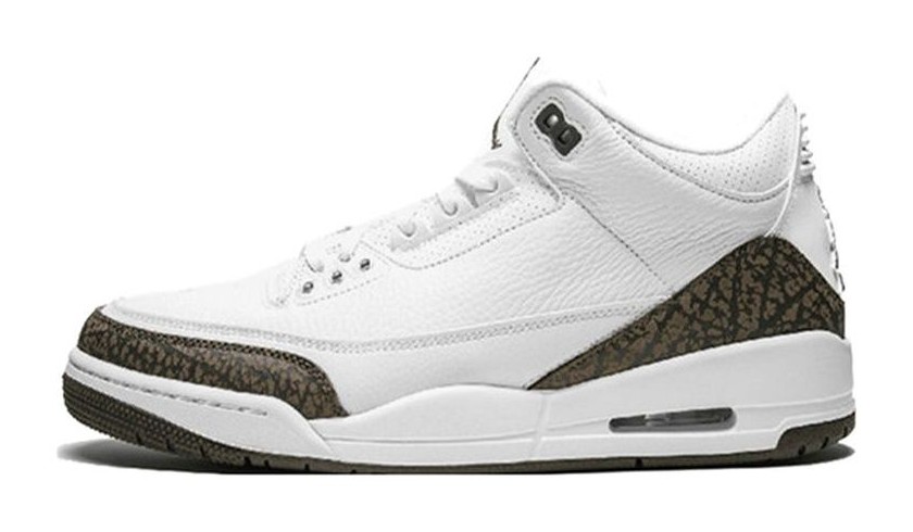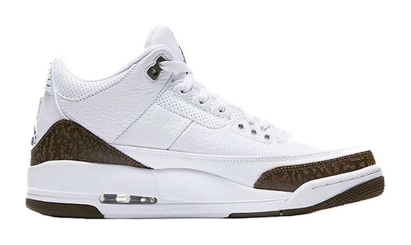 The Air Jordan 3 Retro 'Mocha' (2018) is a re-release of a colorway first seen in 2001, marking its first retro since the initial drop. The shoe features a clean, premium White tumbled leather upper that covers most of the shoe's construction. The contrast is provided by the titular Dark Mocha (a rich, dark brown) color, which is used for the iconic elephant print overlays on the toe and heel. Dark Mocha also colors the Jumpman logo on the tongue and the main sections of the outsole. Final details include a Chrome Jumpman logo on the heel, completing the warm, earthy aesthetic.