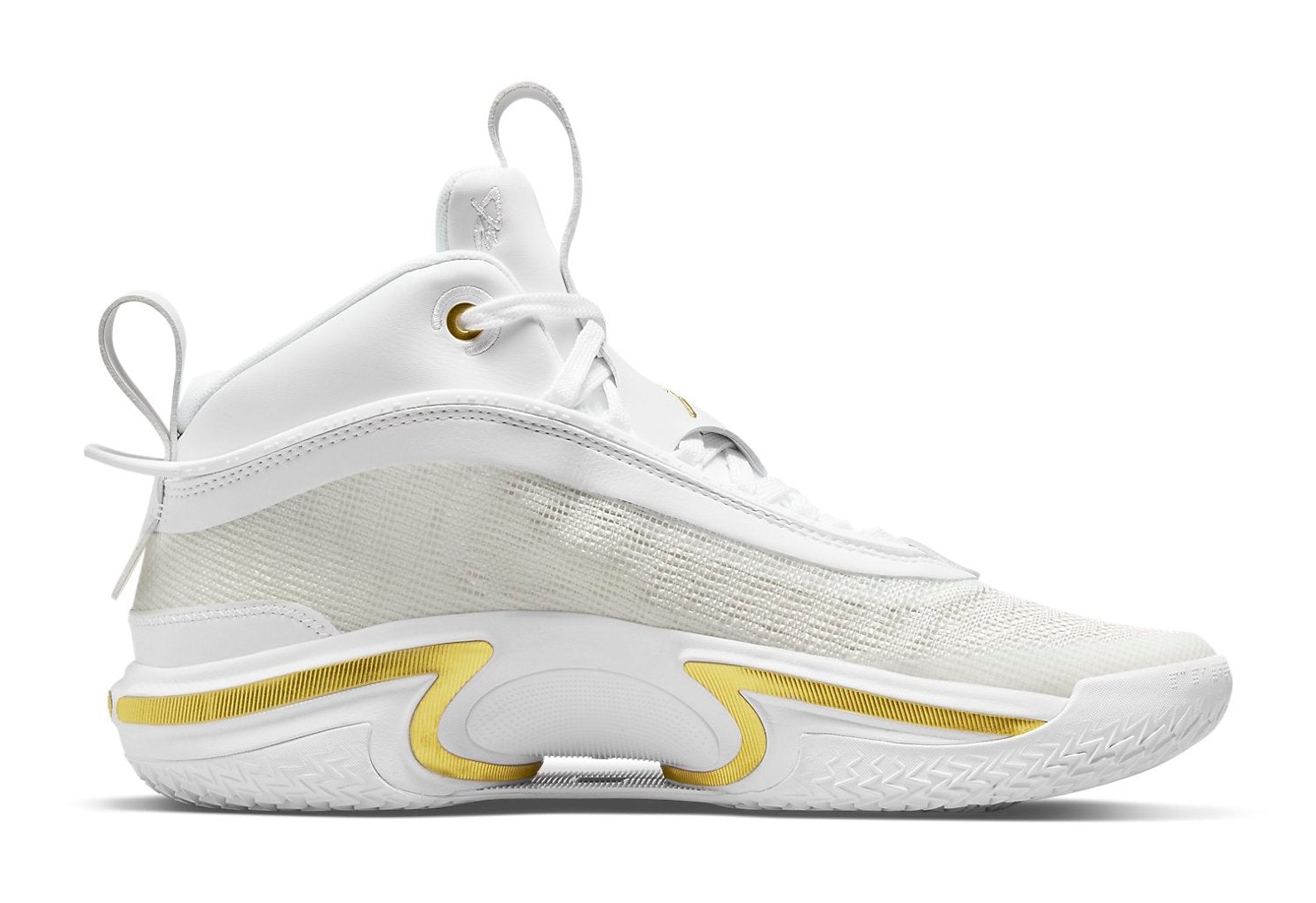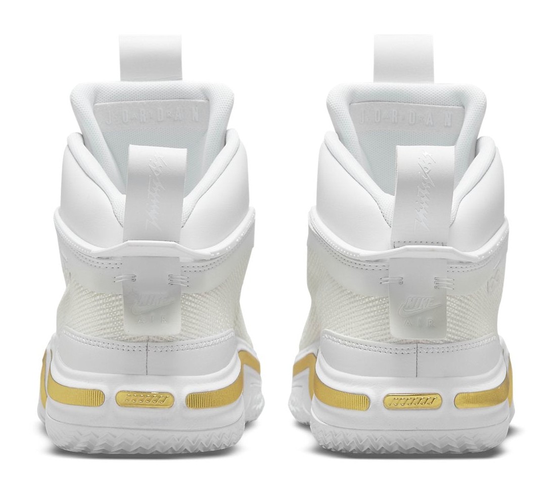 The Air Jordan 36 SE PF 'Glory' is a Special Edition of the performance basketball shoe, believed to be released to commemorate the 2020 Tokyo Olympics, hence the "Glory" nickname and medal-inspired color scheme. The shoe features a clean, striking aesthetic with a predominantly White upper made from the lightweight, breathable leno-weave fabric. This stark white is contrasted by shimmering Metallic Gold accents on the Jumpman logos, key eyelets, and the heel section, giving it a premium, victorious look. Black provides subtle contrast on the tongue, laces, and outsole. The PF outsole includes a more durable rubber compound for use on outdoor courts, while the cushioning system features a full-length Zoom Air Strobel unit stitched directly to the upper and an additional Zoom Air unit under the forefoot.