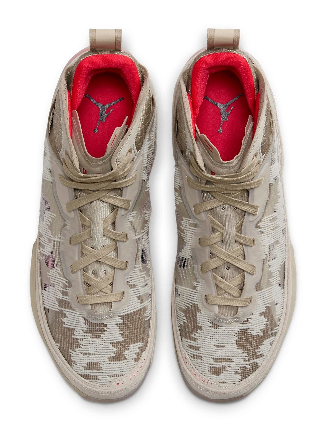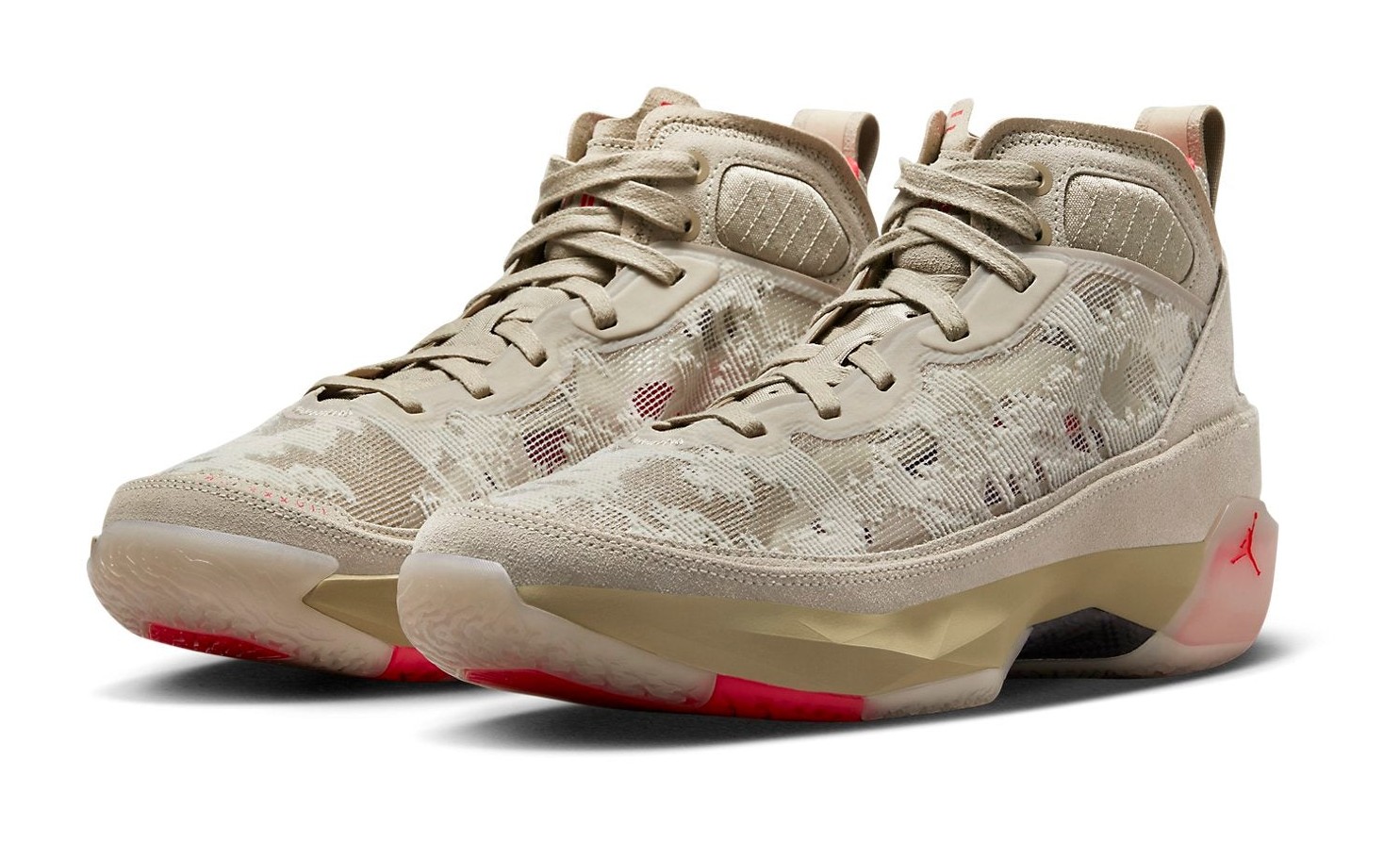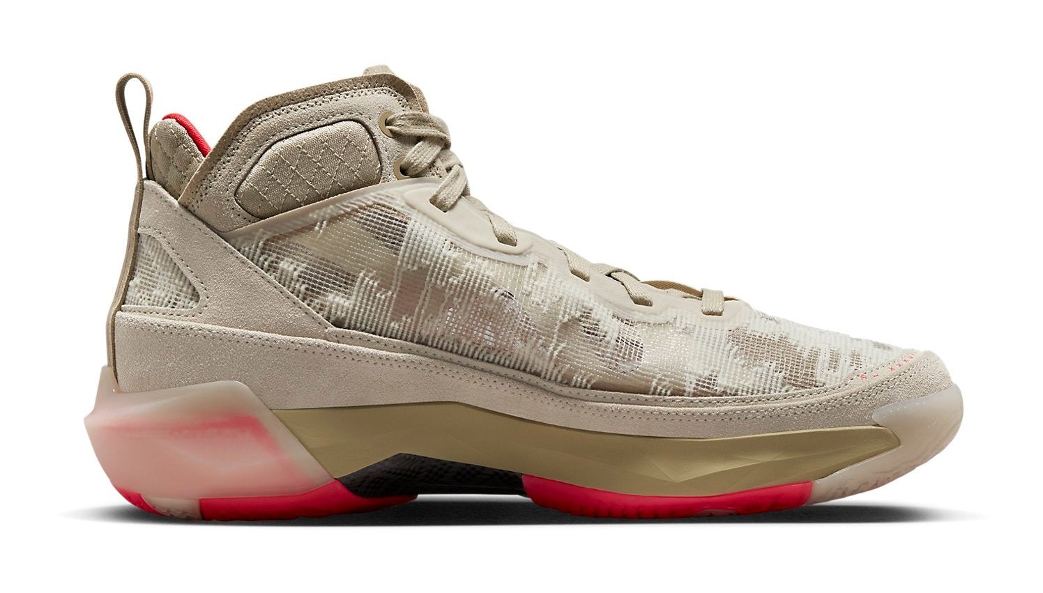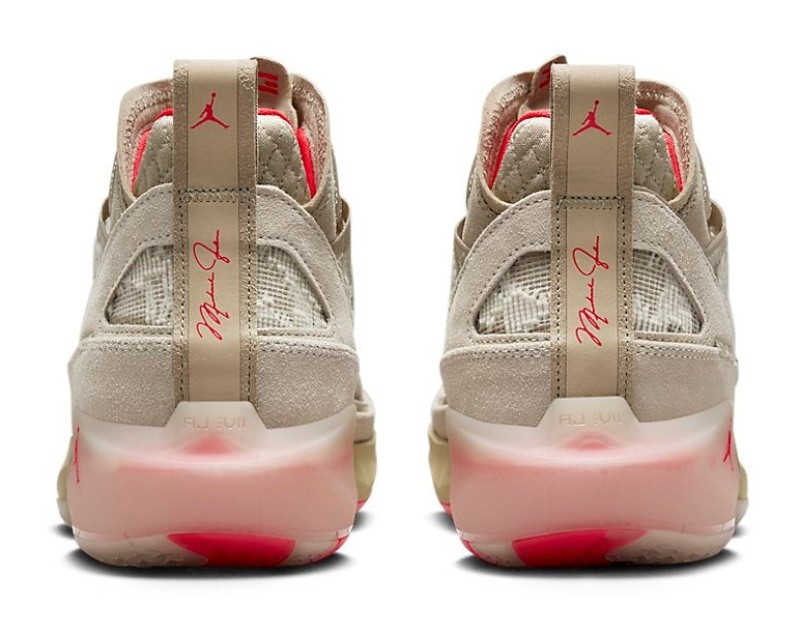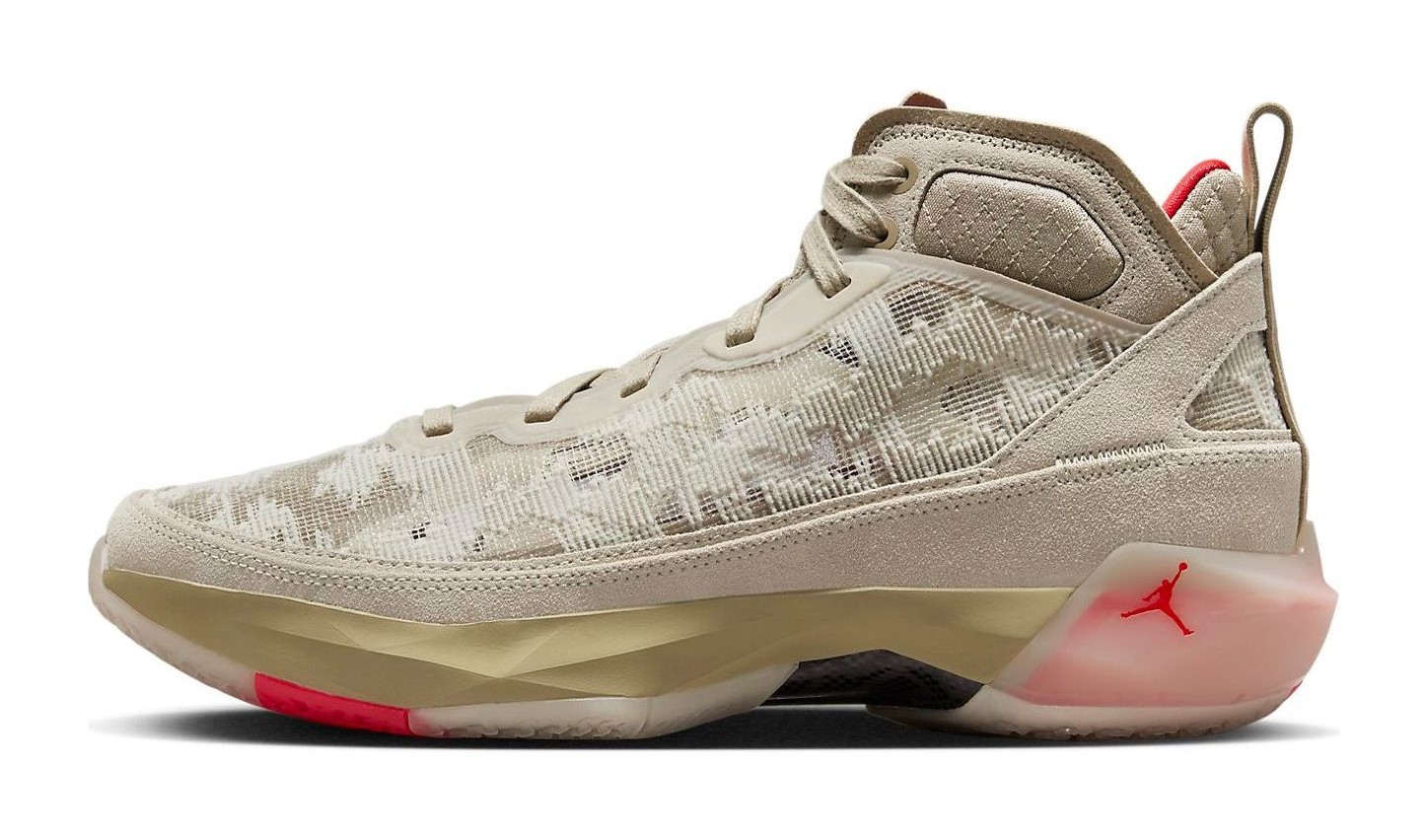 The Air Jordan 37 Premium 'Rattan' applies a lifestyle-focused, monochromatic aesthetic to the performance basketball silhouette. The entire upper is dressed in a Rattan and Limestone color scheme (various shades of wheat/tan), which includes a suede mudguard and a breathable, intricate leno-weave fabric on the mid-panel and collar. The construction, designed to replicate the support of a taped ankle, is elevated by the premium materials. The neutral base is starkly contrasted by vibrant Siren Red accents on the interior lining, branding details on the tongue and heel, and on the rubber outsole. The shoe features the Air Jordan 37's signature cushioning system, including Formula 23 foam and a double-stacked Zoom Air unit in the forefoot.