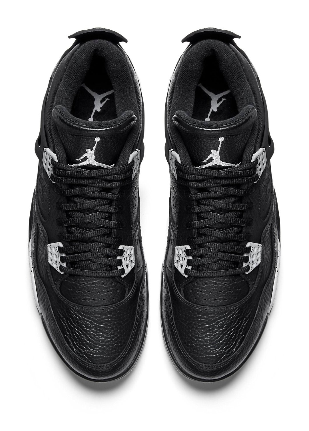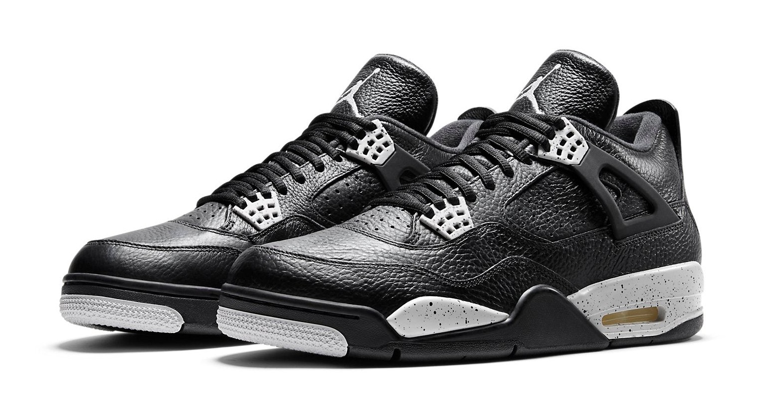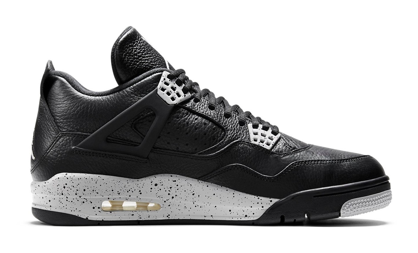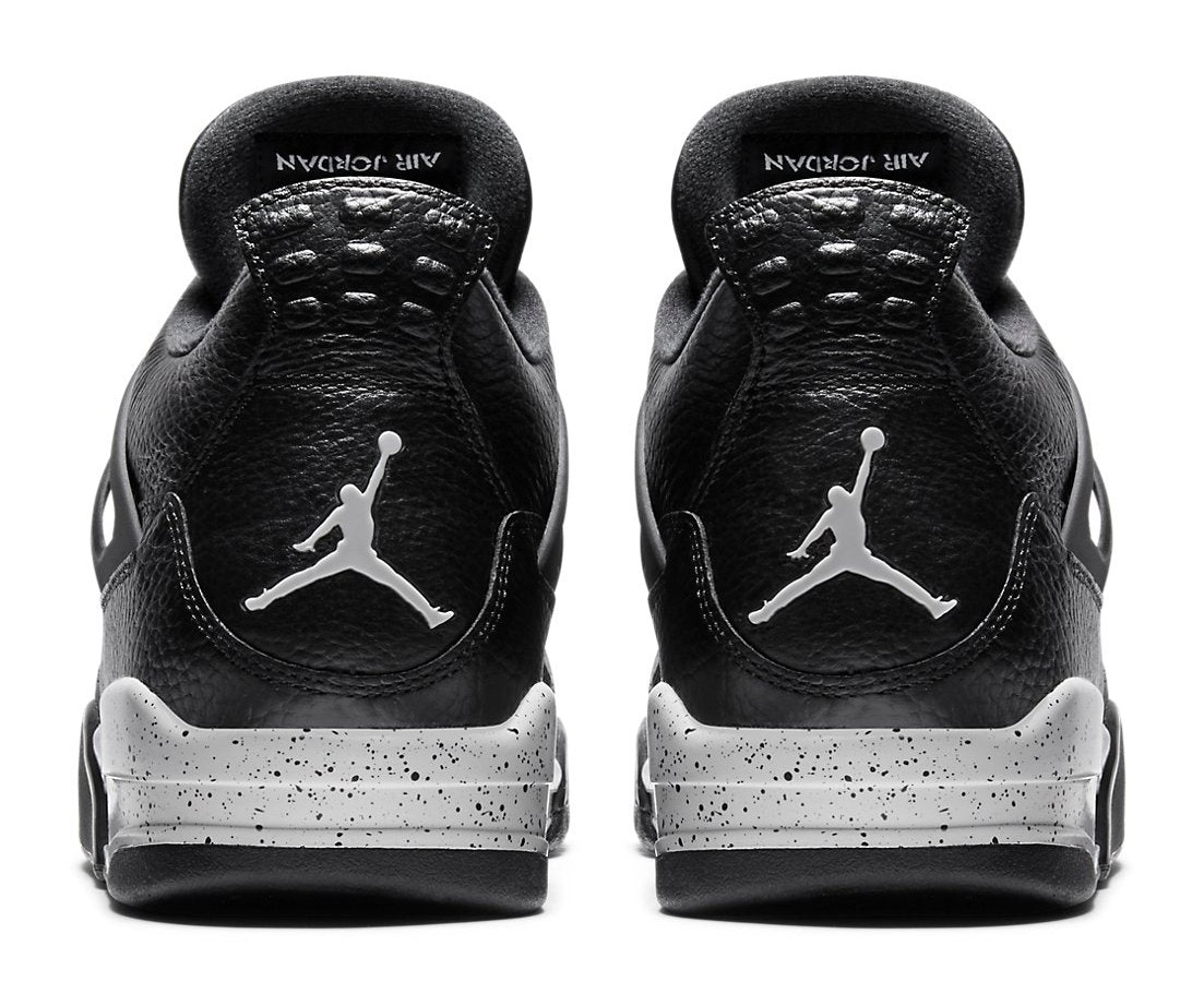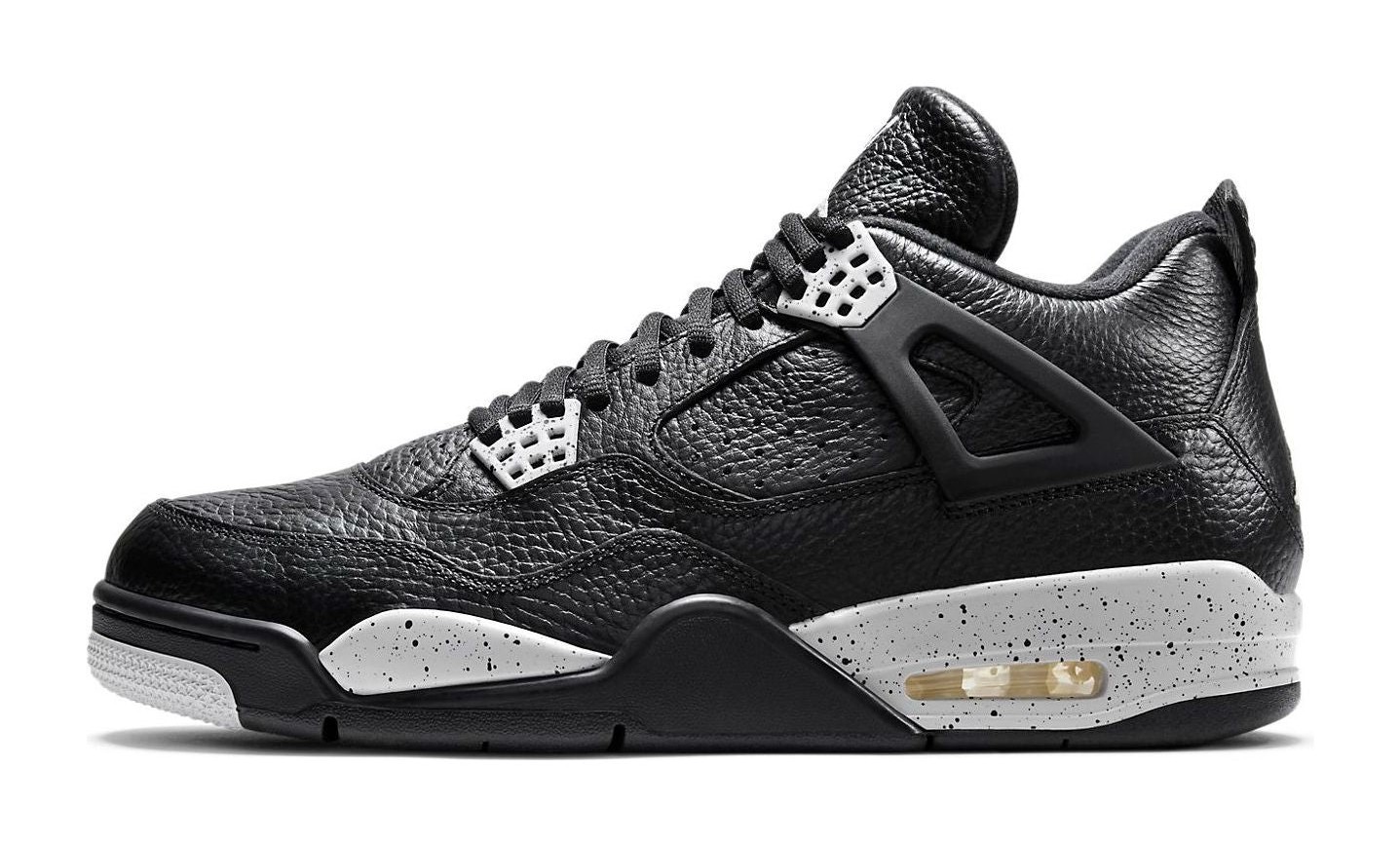 The Air Jordan 4 Retro LS 'Oreo' is a highly anticipated retro of a colorway first introduced in 1999. It features a premium, tumbled black leather upper that replaces the traditional mesh netting on the side panels and tongue with perforated leather for a sleeker, lifestyle-focused look. The shoe gets its "Oreo" nickname from the speckled 'Tech Grey' accents on the molded eyelets and the white midsole, which also features black speckling. The simple color scheme, combining black, white, and grey, offers a versatile and clean aesthetic, finished with a grey Jumpman logo on the tongue and heel.