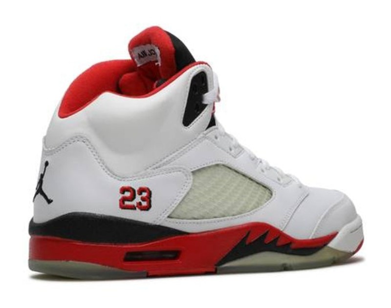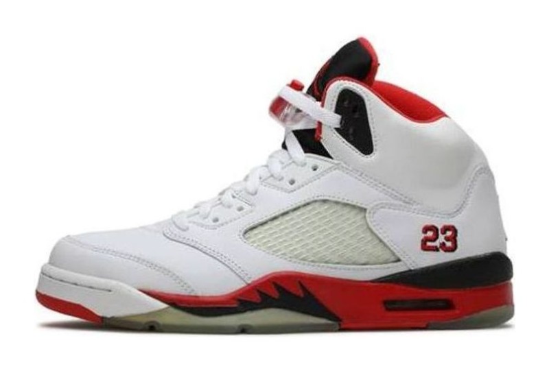 This is a retro release of one of the four original (OG) colorways of the Air Jordan 5 from 1990. It features a clean White leather upper with the signature clear mesh netting on the side panels. The color-blocking is defined by the bold Black midsole, which is accented with the prominent Fire Red shark-tooth design. The Fire Red color is also used on the inner lining and the Jumpman logo on the tongue. Crucially, this 2006 release is characterized by the presence of a Black embroidered '23' on the heel, which was a feature on the original 1990 model but is often omitted or changed in different retro years.