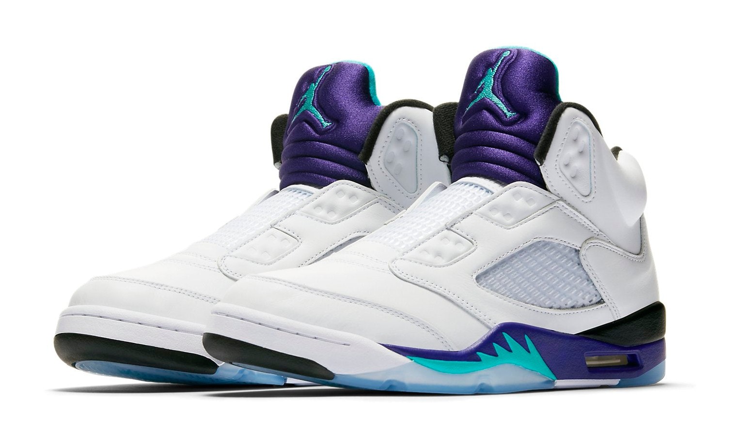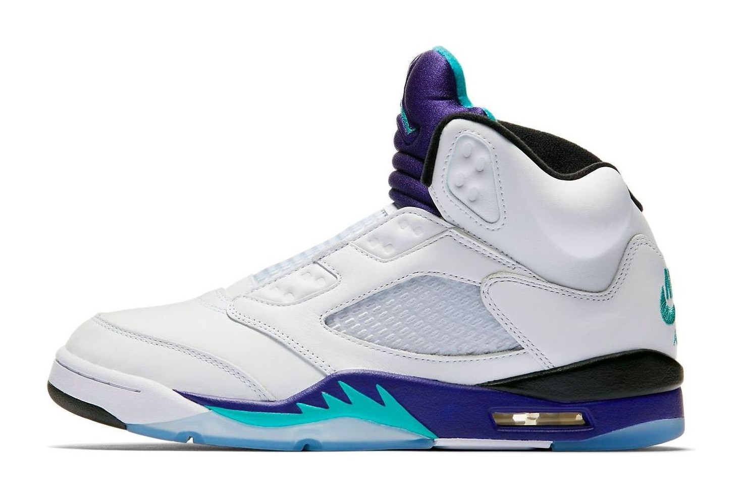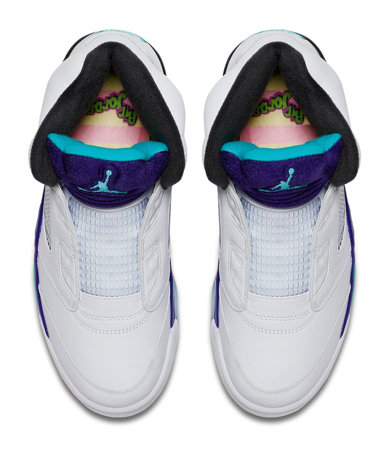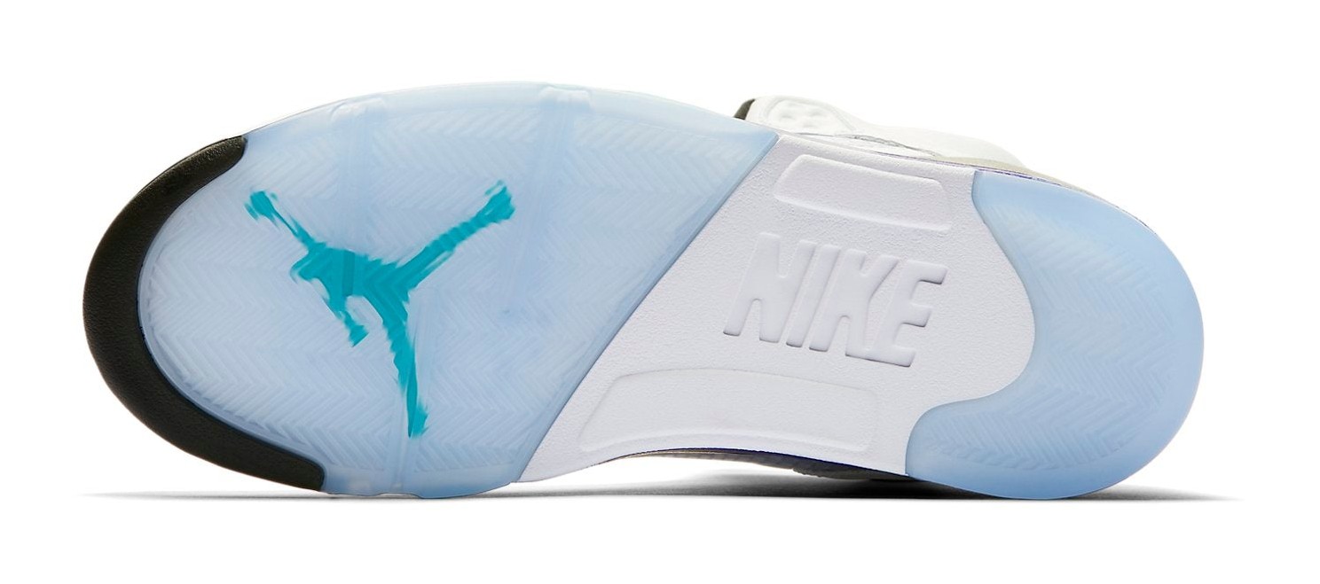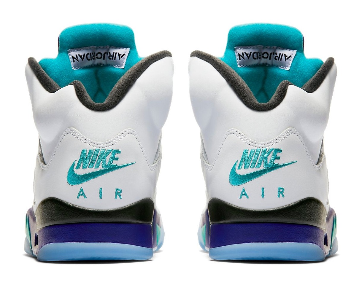 The Air Jordan 5 Retro NRG 'Fresh Prince' was released to celebrate Will Smith's 50th birthday, paying homage to his character Will's penchant for wearing the Air Jordan 5 on The Fresh Prince of Bel-Air—specifically, the 'Grape' colorway worn without laces. This model features a white leather upper with classic Grape Ice and New Emerald accents on the tongue lining and midsole, mirroring the original 'Grape' colorway. A defining feature is the absence of the lace toggle and the fact that the eyelets are entirely sealed, forcing the wearer to go laceless like the Fresh Prince. The inside of the tongue features the text "WEST PHILADELPHIA" and the insole has a custom 'Air Jordan' graphic written in the show's graffiti-style title font. The shoe is completed with a translucent outsole.