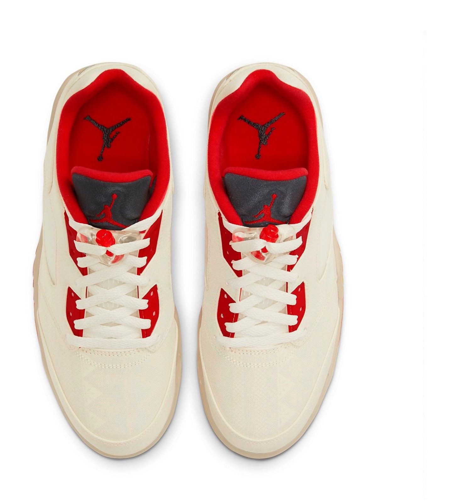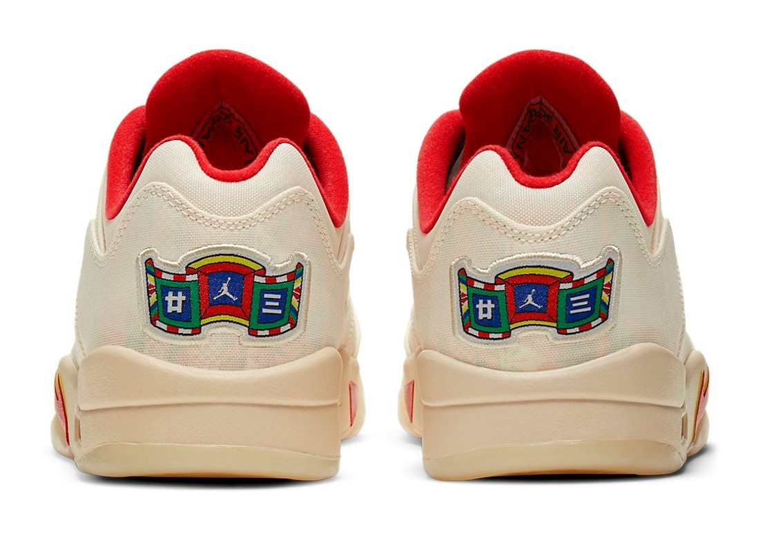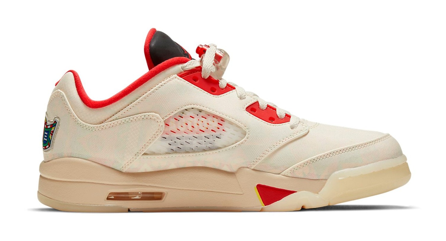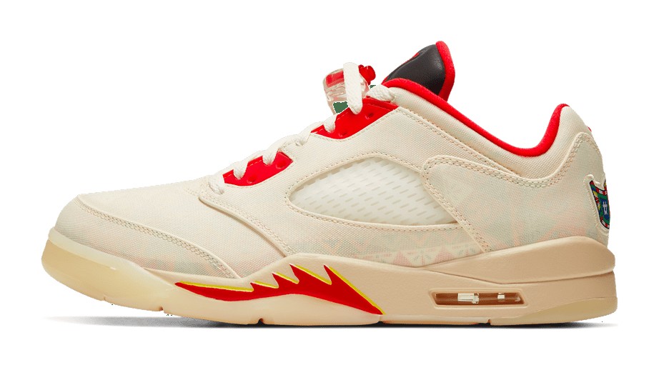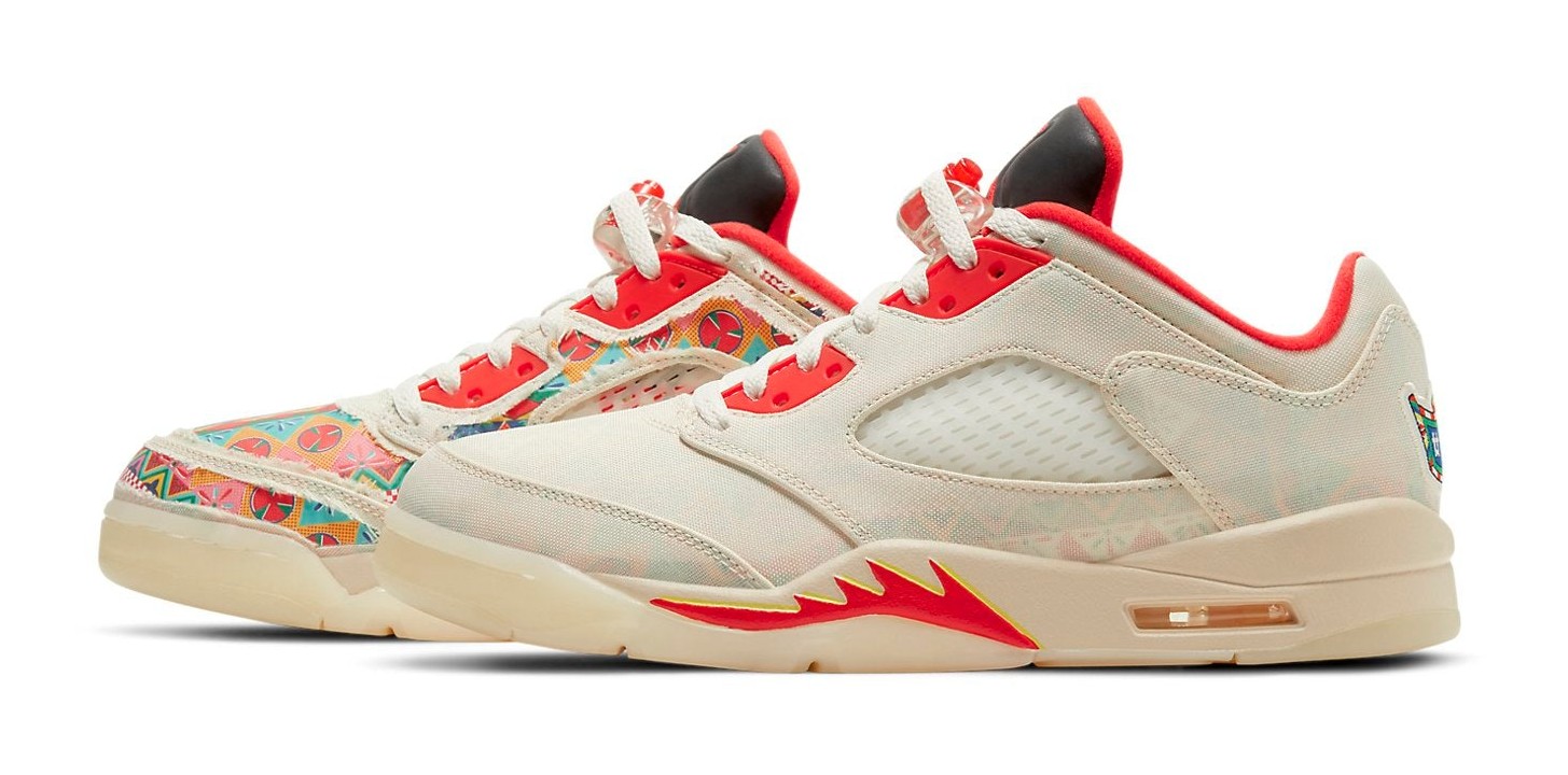 The Air Jordan 5 Retro Low 'Chinese New Year' (2021) was released to celebrate the holiday, drawing inspiration from celebratory temple fairs and firecrackers. Its most distinctive feature is the Sail-colored textile upper that is designed to be a tear-away canvas, which, when removed, exposes a vibrant, multi-color firecracker-inspired graphic pattern underneath. The shoe features accents in Chile Red on the molded eyelets, collar lining, and the shark-tooth detailing on the midsole, which is also Sail-colored. Additional festive details include a special embroidered banner graphic on the heel with Chinese characters representing "23," and the word "ACTION" visible beneath the netted side panel. The shoe is finished with a translucent outsole.