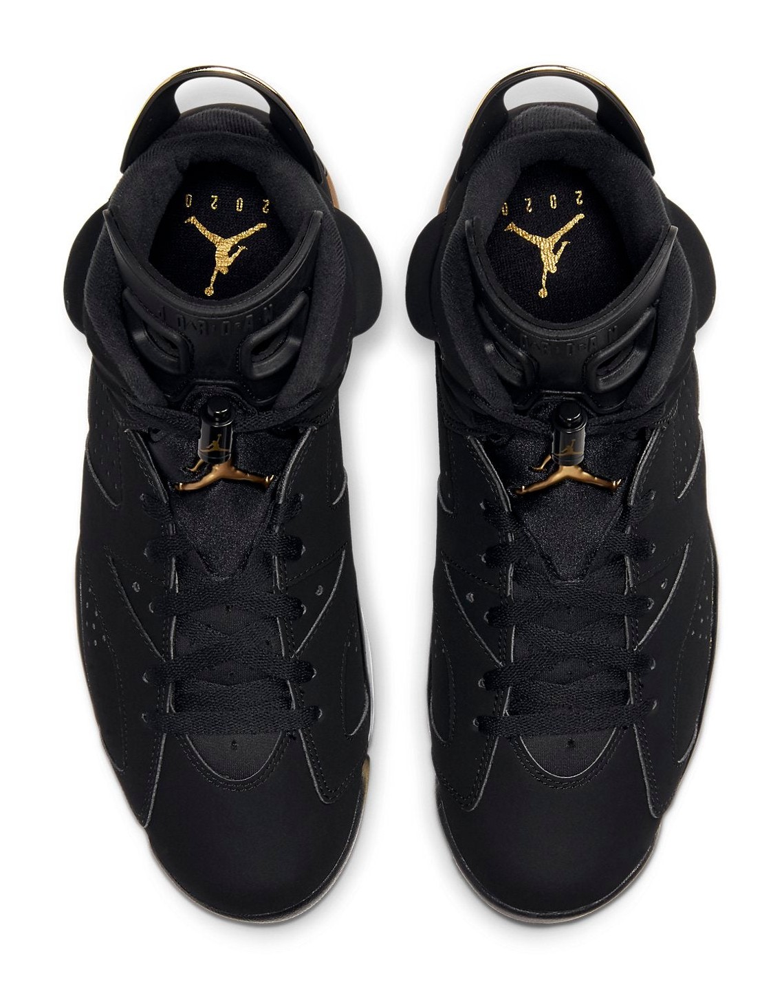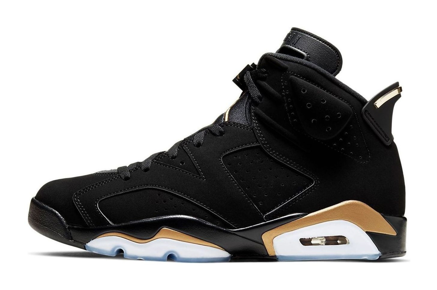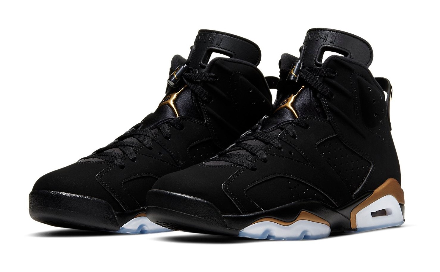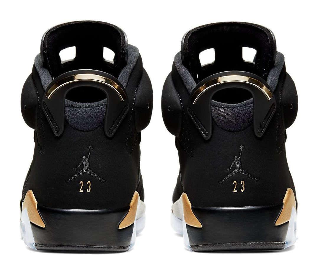 The Air Jordan 6 Retro "DMP" (Defining Moments Pack) is a re-release of the popular colorway that first appeared in 2006. The shoe features a black nubuck suede upper, providing a premium look and feel. The black base is accented with "Metallic Gold" hits on the midsole, heel pull tab, lace lock, and the embroidered Jumpman logos on the tongue and heel, symbolizing Michael Jordan's championships. The design is completed with an icy translucent outsole and includes special accessories like a gold dog tag-style hang tag and a black and gold lace lock. This release pays homage to the legendary 2006 Defining Moments Pack that celebrated Michael Jordan's legacy.