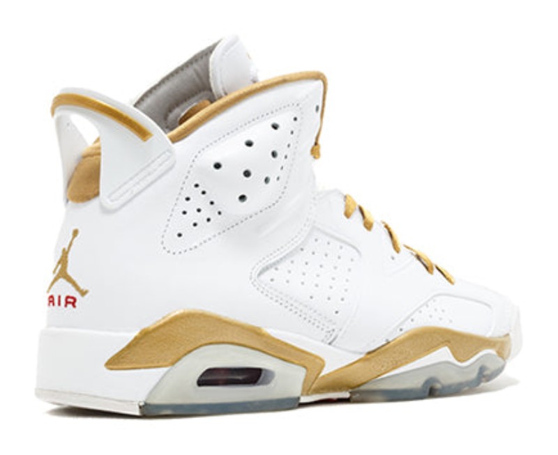 This sneaker is the white and gold portion of the "Golden Moments Pack," released to commemorate the 20th anniversary of Michael Jordan's gold medal win with the "Dream Team" at the 1992 Barcelona Olympics. The shoe features a premium white leather upper with bold metallic gold accents on the midsole, lace locks, and branding elements. It is distinguished by a red "AIR" heel badge, a translucent blue-tinted outsole, and a patriotic American flag graphic printed on the insole.