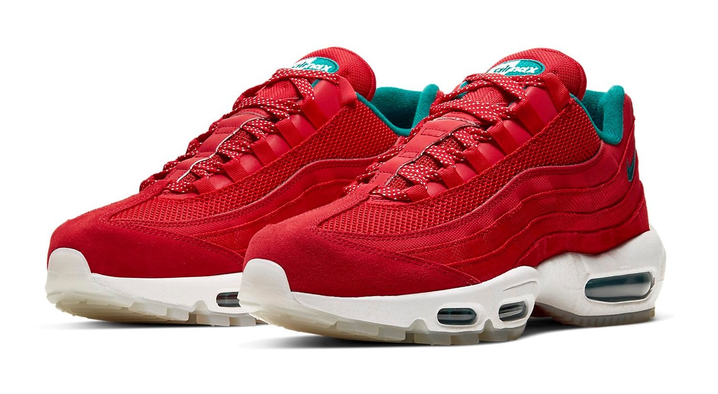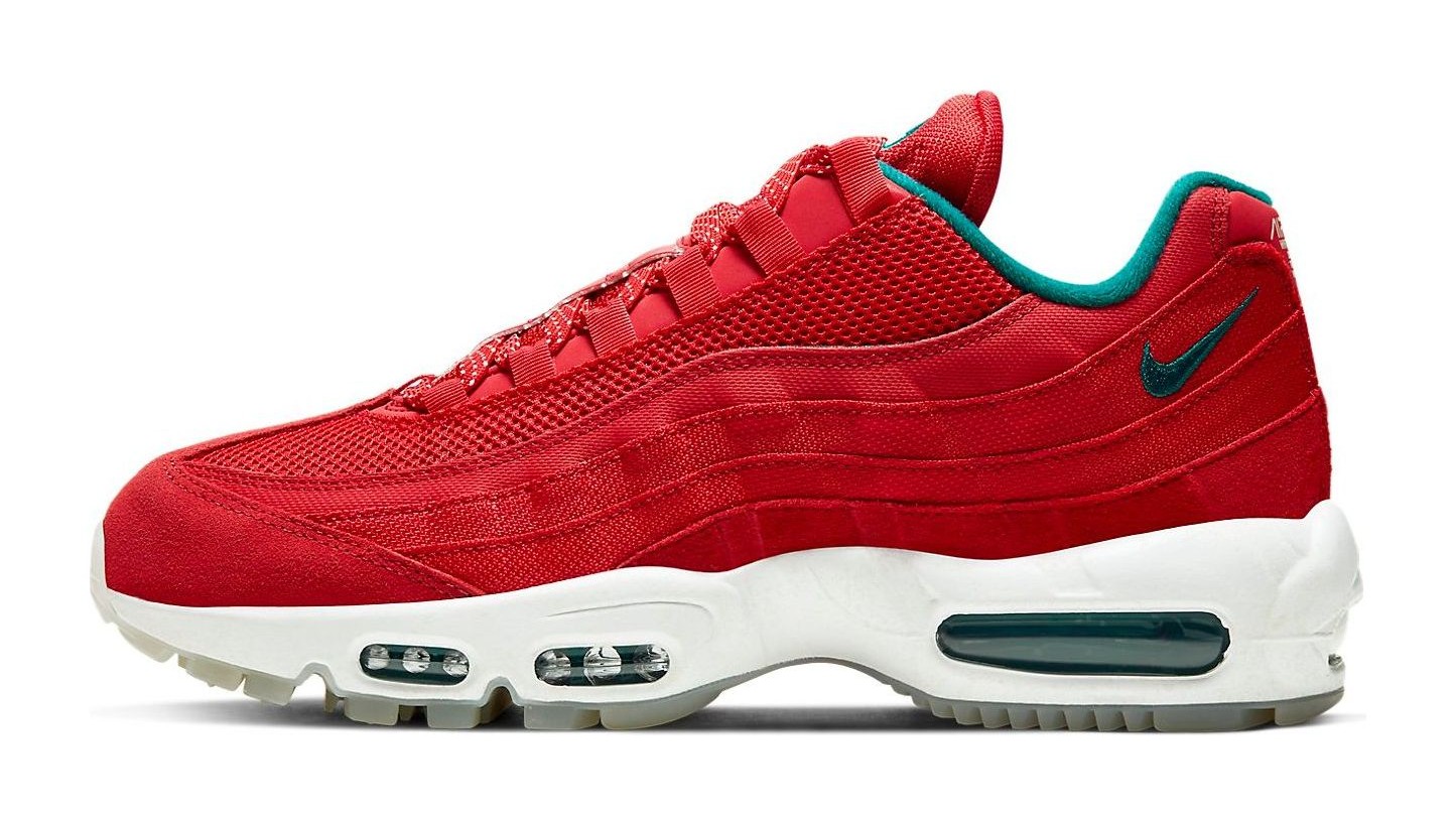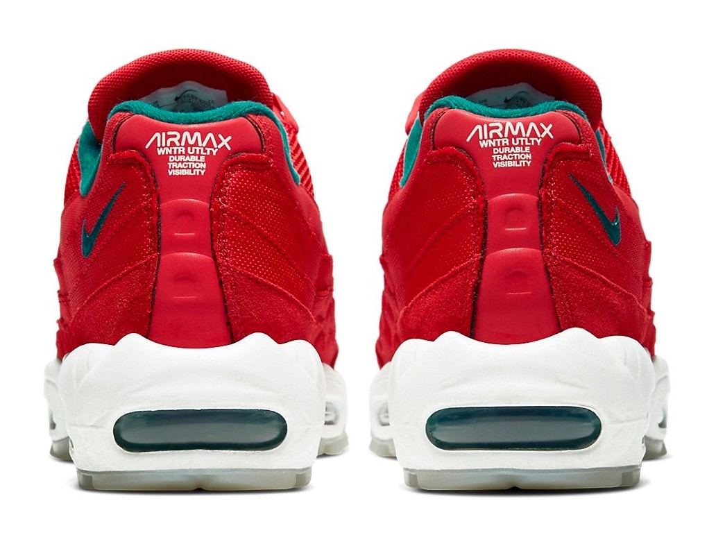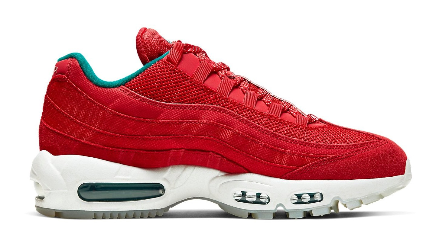This utility-focused, Japan-exclusive edition of the Air Max 95 is inspired by Mount Fuji. The durable, water-resistant upper is primarily "University Red," intended to evoke the mountain's striking "Red Fuji" appearance at sunset. This warm red is starkly contrasted by "Bright Spruce" (a cool blue/green) accents on the branding and visible Air Max cushioning units, symbolizing the mountain's serene, snow-capped summit. The shoe features a rugged outsole for enhanced traction and includes unique details such as a mountainous graphic under the translucent outsole and a special summit-style flag hang tag.
