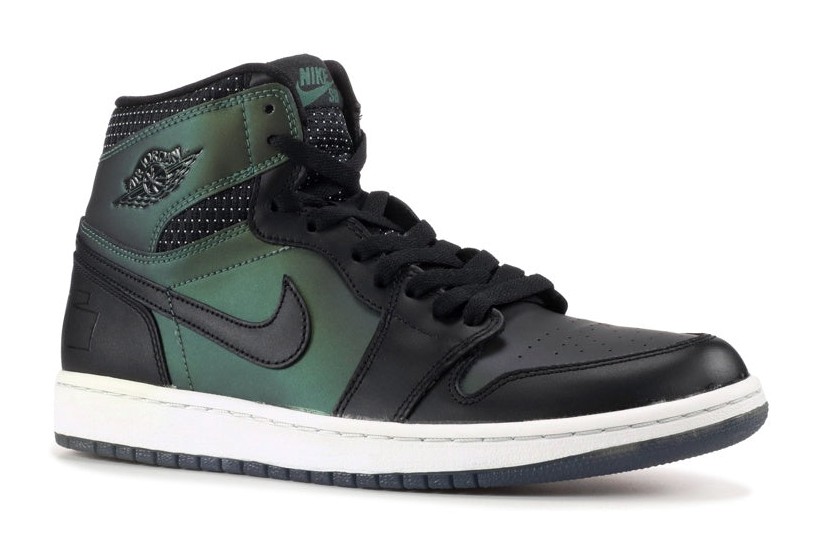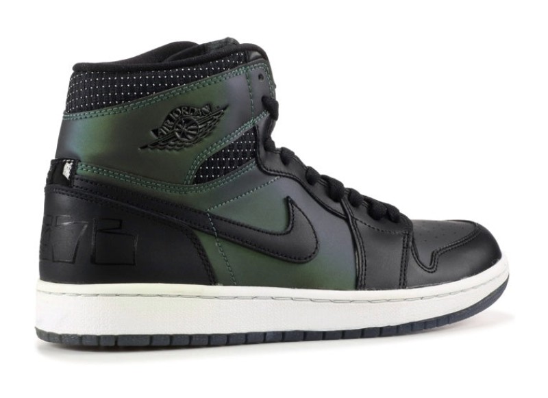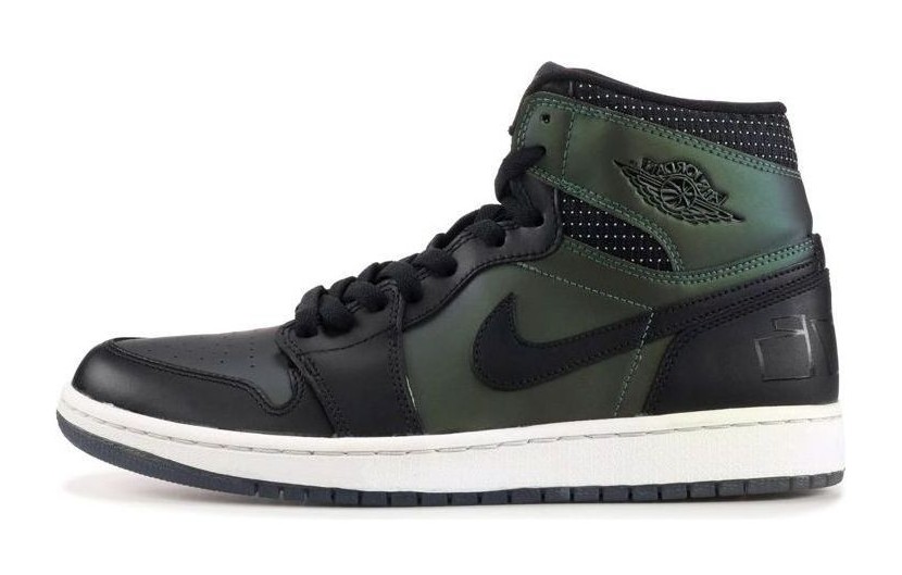 This highly coveted sneaker is a collaboration with artist and photographer Craig Stecyk, honoring the original skateboarders who adopted the Air Jordan 1 for skating in the mid-1980s. The shoe features a full leather upper with a Black base that has a unique iridescent, metallic green/silver sheen that can appear matte black or reflective depending on the light. The black overlays feature a cross-hatch or tribal-like pattern, and the heel is marked with hand-scrawled "AJ ONE SB" script in metallic silver. The shoe released under the Nike SB (Skateboarding) line, utilizing the classic Air Jordan 1 High silhouette.