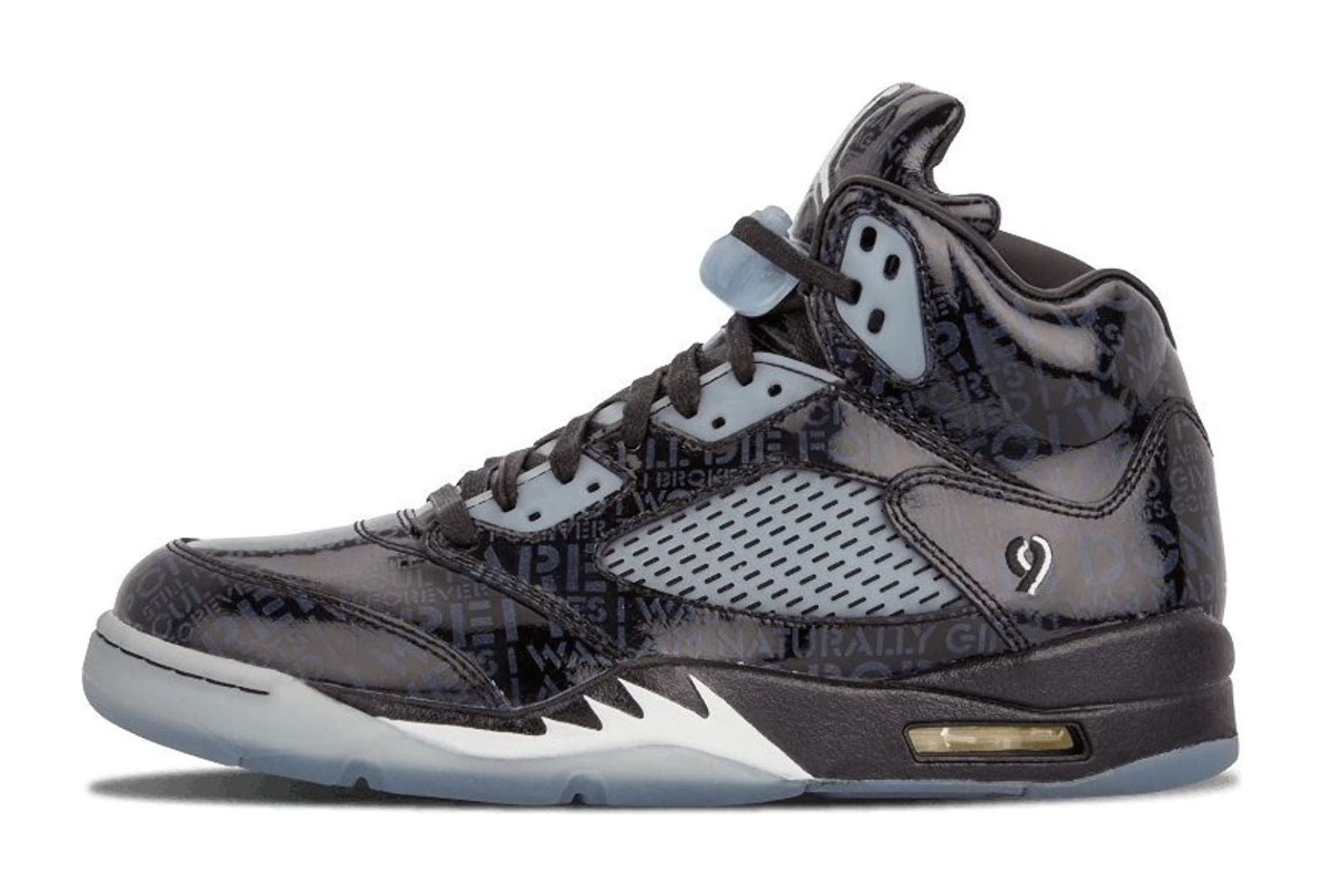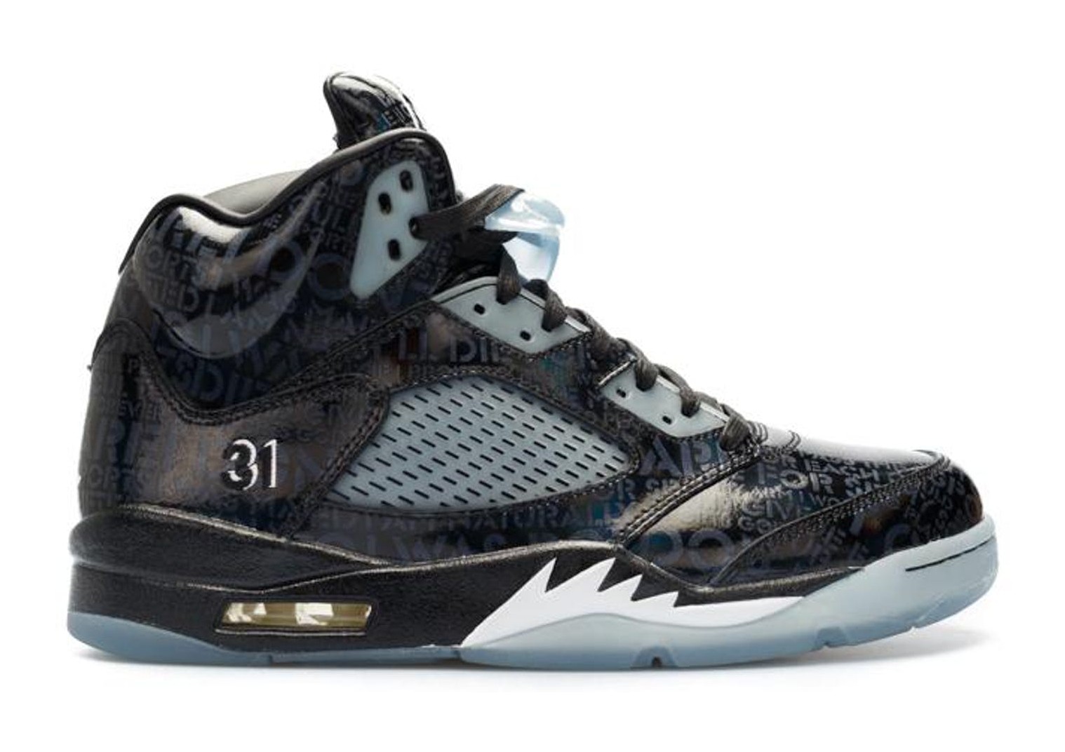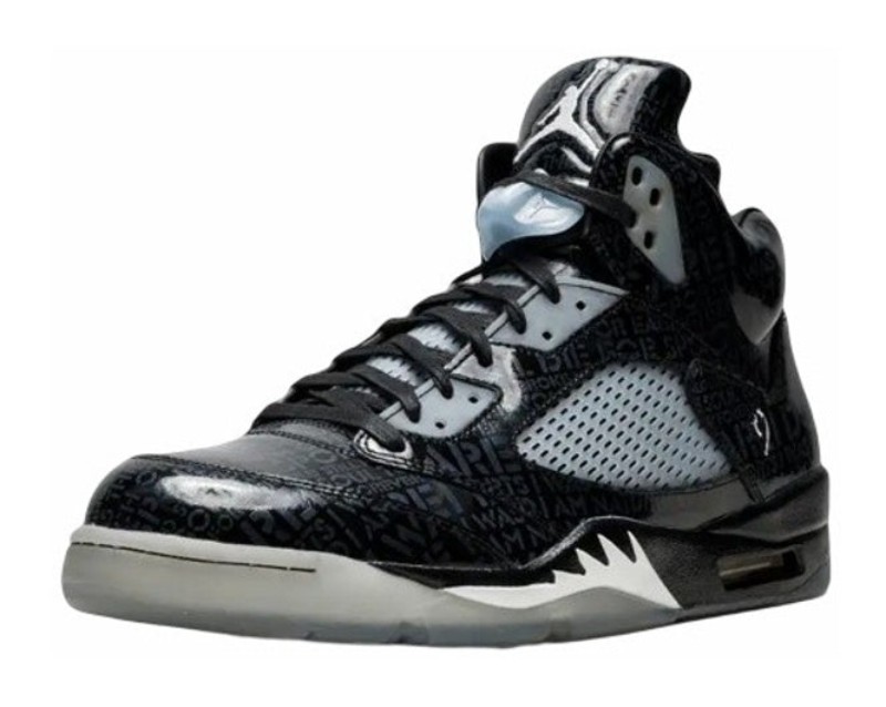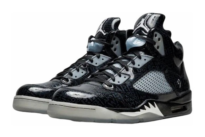 The Air Jordan 5 Retro 'Doernbecher' (633068-010) was designed by 12-year-old Isaac Arzate as part of the 2012 Doernbecher Freestyle program, though it was released in 2013. Isaac tragically passed away during the design process, and his family helped finalize the design in his honor. The shoe features a glossy black patent leather upper with tonal (same-color) text across the material. This text is a poem Isaac wrote the day before his passing, which is only visible when the shoe is exposed to blacklight (UV light). Other personalized details include his baseball and basketball numbers, his initials, and his birth and passing dates on the inner tongue tags. The shoe also includes glow-in-the-dark accents on the translucent side netting, outsole, and the "shark teeth" on the midsole. The pair typically included a special UV flashlight accessory to reveal the hidden details.