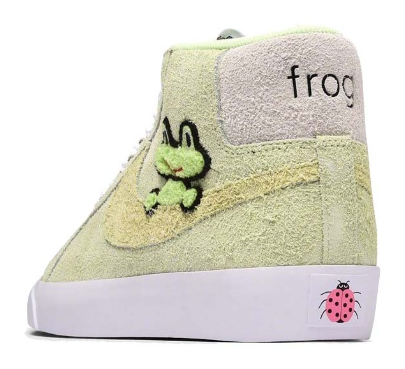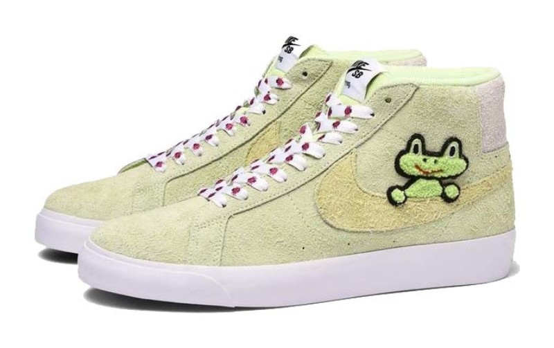 A collaboration with Frog Skateboards, this mid-top Blazer SB features a pale green suede upper. A playful green frog graphic and a chenille Swoosh sit on the lateral side. Pink ladybug details are included on the white laces and embroidered on the heel. A white vulcanized midsole and sole complete the look, while a Zoom Air unit in the sockliner provides cushioning.